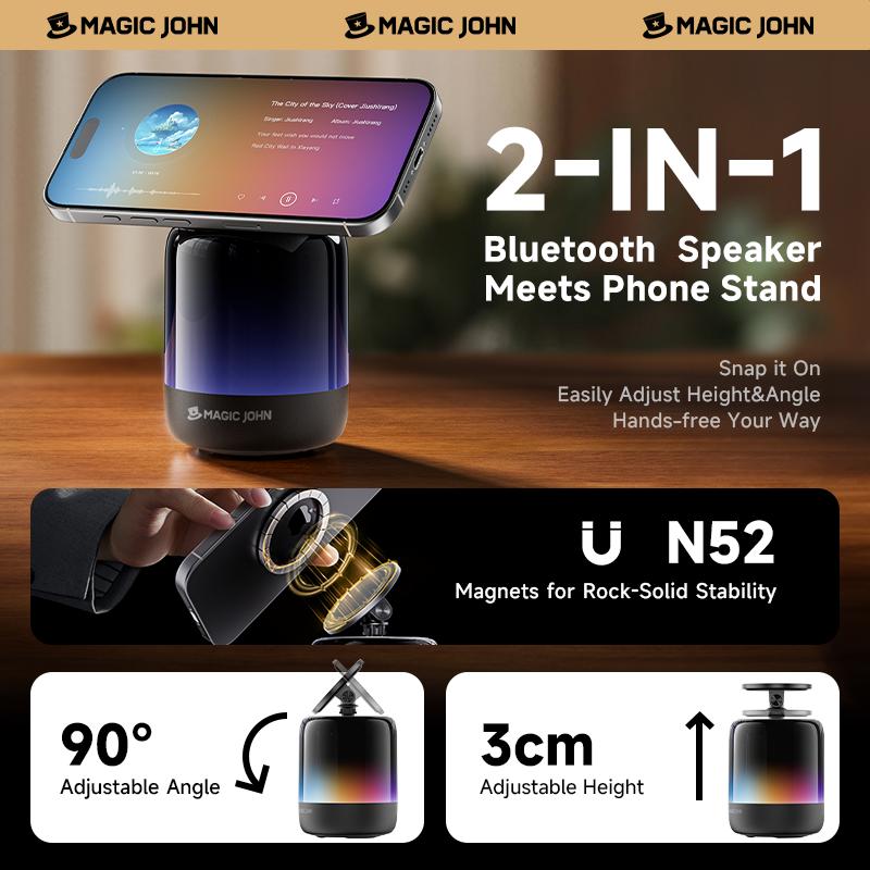 Ever wish your Bluetooth speaker could double as a cool phone stand? Meet the MAGIC JOHN 2025! This sleek 2-in-1 gadget not only pumps out rich 360° surround sound but also holds your phone magnetically with rock-solid stability. Whether you’re catching up on videos, working, or just chilling, the adjustable stand lets you find the perfect angle. The upgraded Bluetooth 5.3 keeps your tunes flowing smoothly up to 20 meters away, and with multiple playback modes including TF card and FM radio, you’re never out of options. Plus, the dynamic RGB lights dance along with your music, turning any room into a party zone or adding a soft glow for cozy nights. Compatible with iPhone 12-16 series and most Android phones, it’s a perfect gift for anyone who loves tech and style. Inside the box, you’ll find the speaker stand, a charging cable, and a handy user guide. Ready to upgrade your audio and phone setup? Grab the MAGIC JOHN 2025 and light up your life with sound and color!