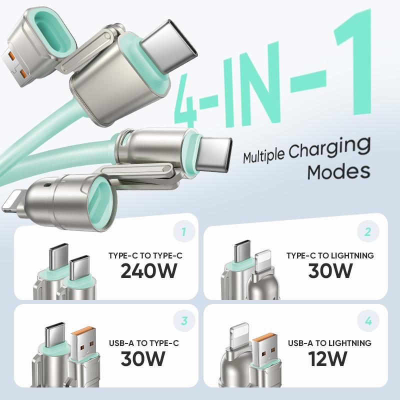 Inside the box, you get a versatile 4-in-1 cable featuring USB-A, USB-C, and Lightning connectors, covering multiple devices and charging modes. Whether you’re at home, in the car, or on the go, this cable keeps you powered up and refreshed.
