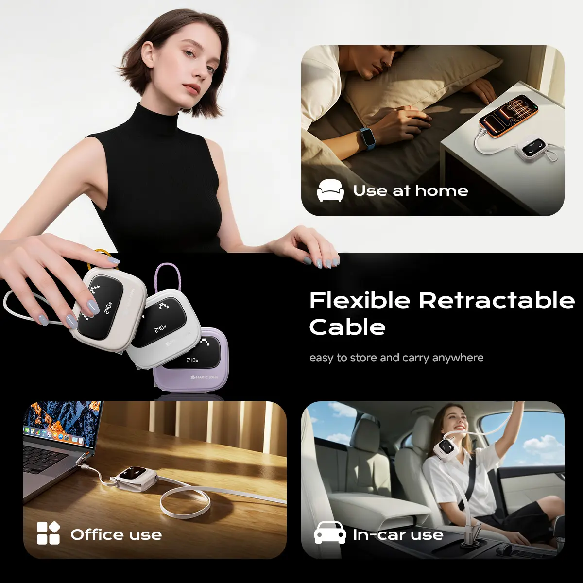 5. MAGIC JOHN 4-in-1 Retractable USB Charging Cable – 240W Fast Charging & Data Sync | Compatible with iPhone & Android | Retractable CarPlay Cable