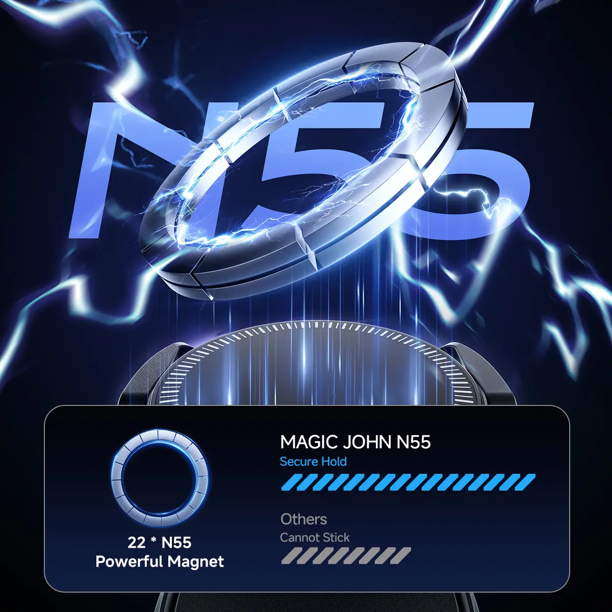 Magnetic grip plus clamp, dual hold system — works with MagSafe and non-MagSafe phones.