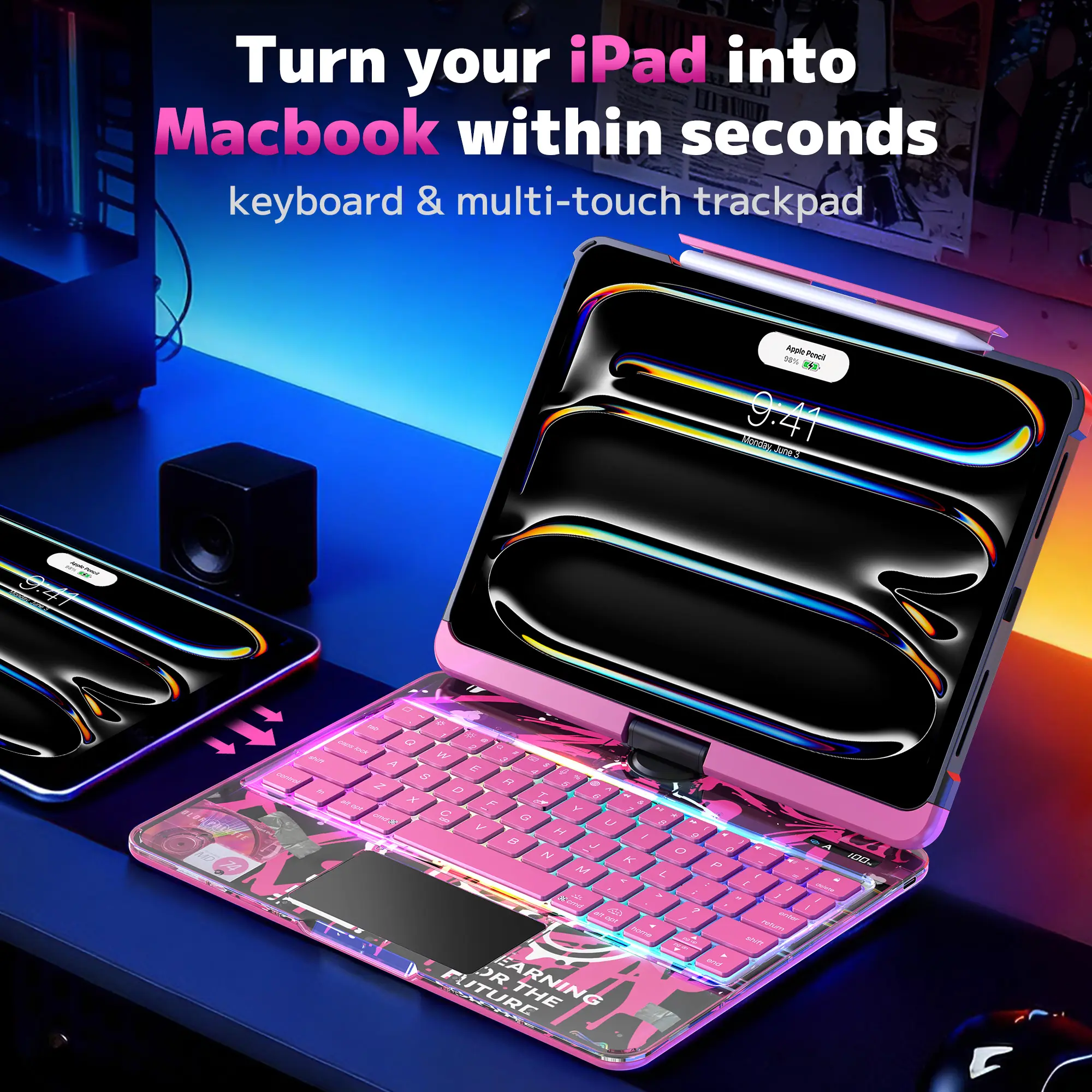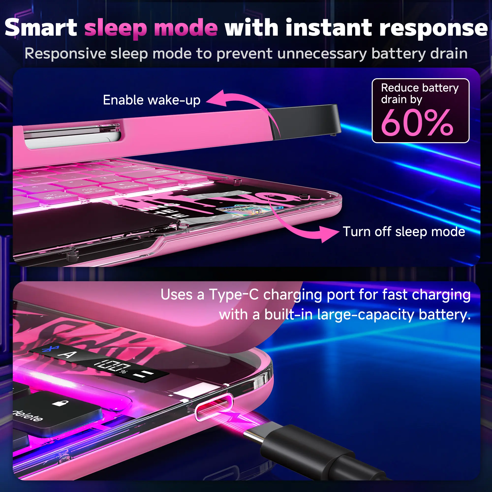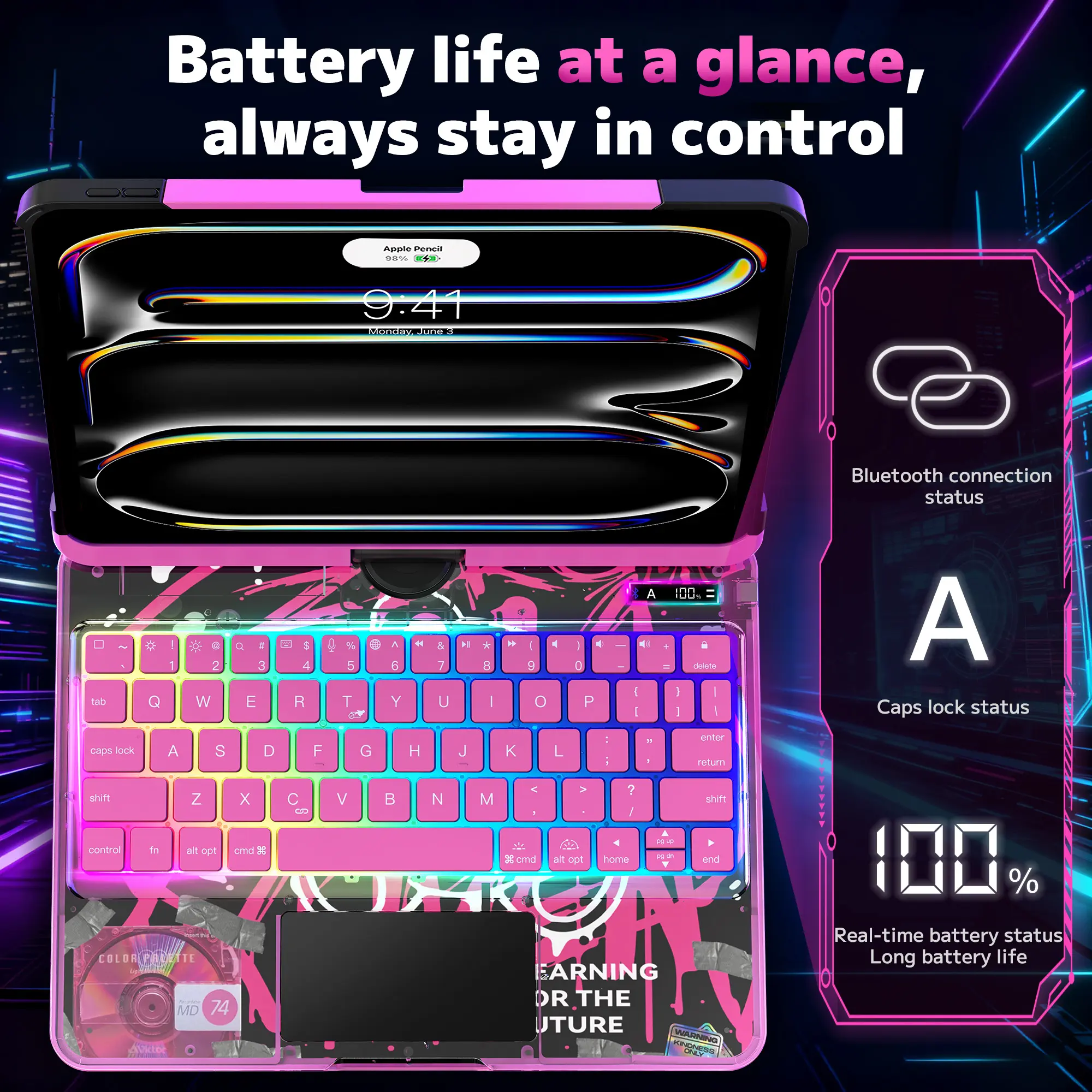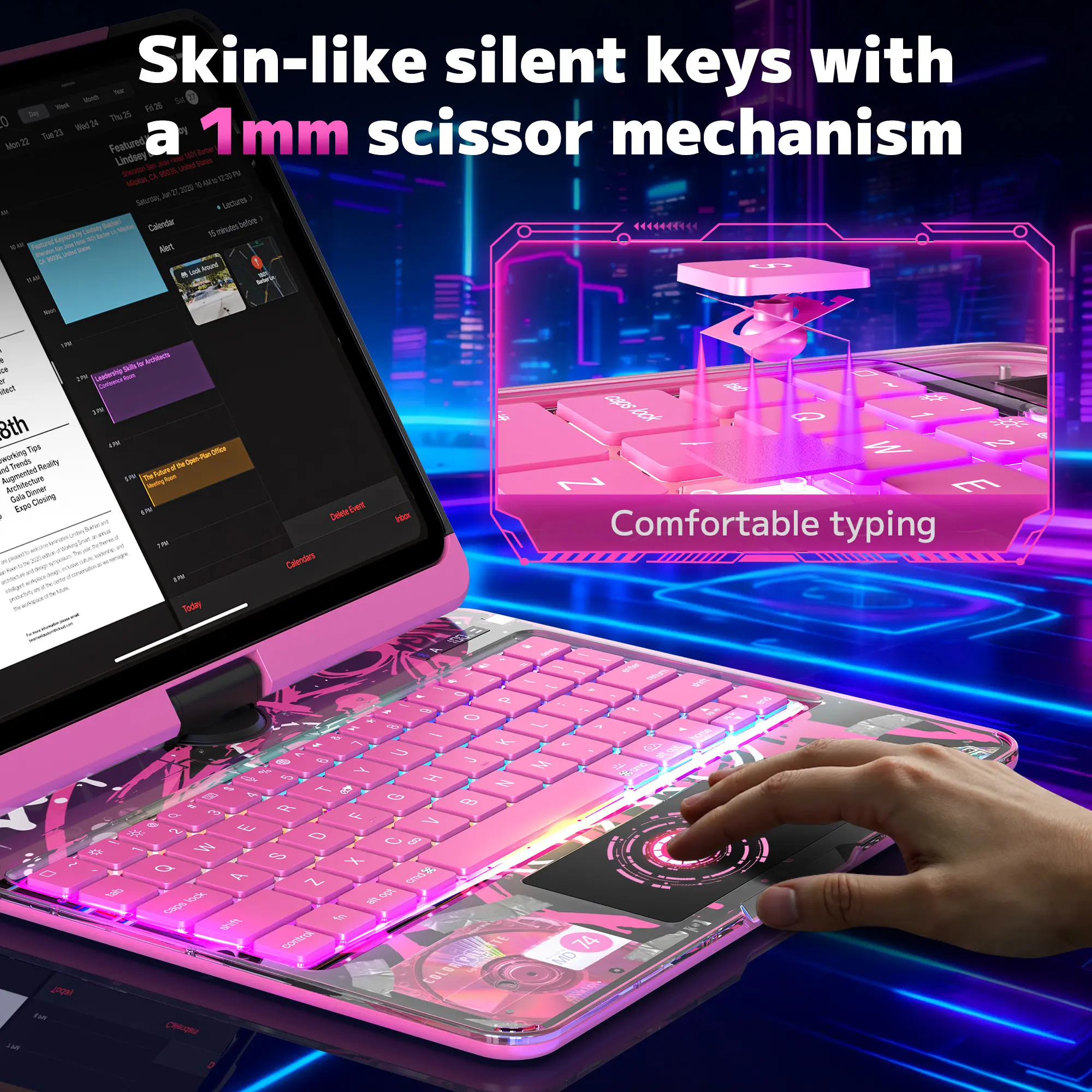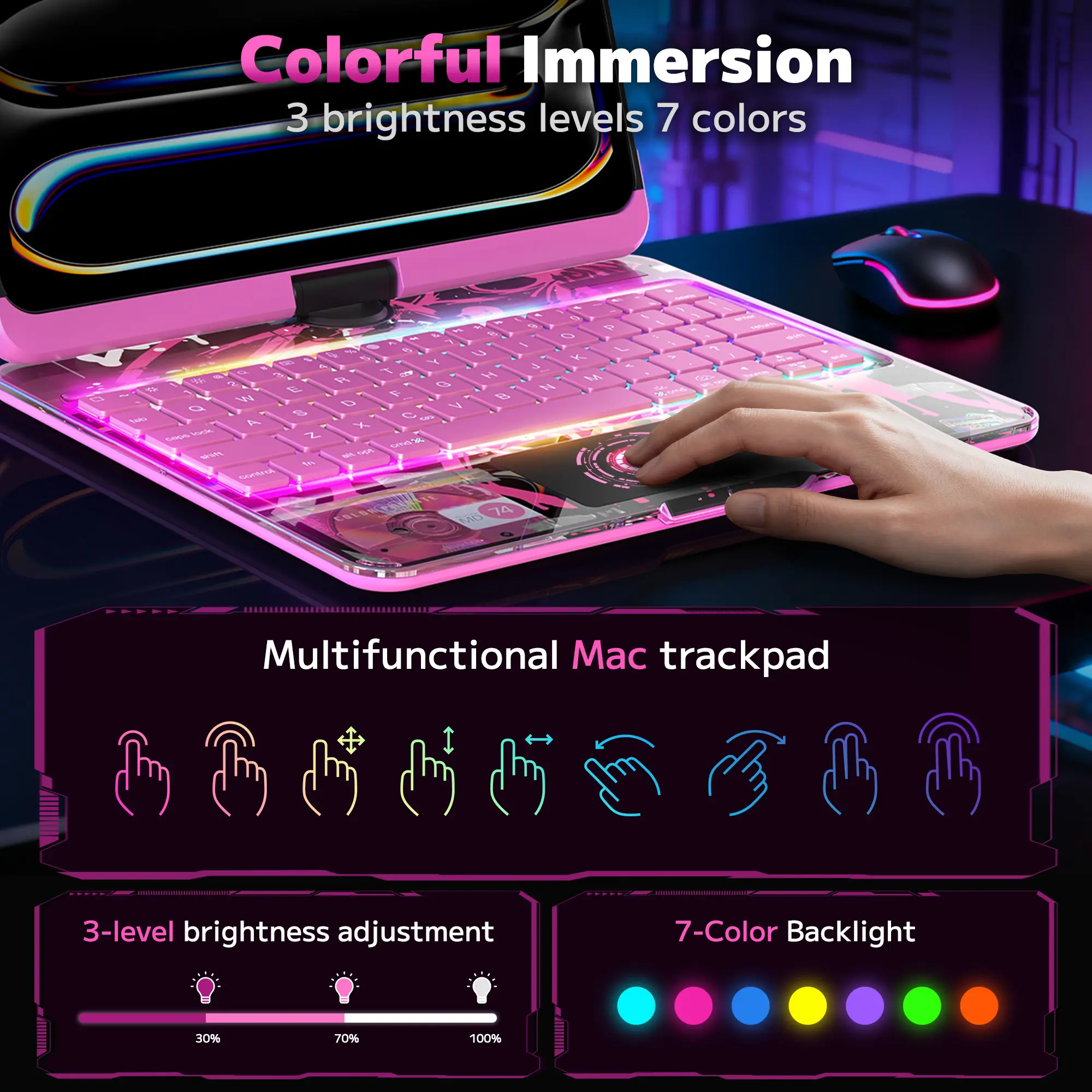 ·【7-Color Backlit Keyboard】Designed for functionality and style, the keyboard includes 7 adjustable backlight colors and MAC-style scissor-switch keys, offering a smooth and responsive typing experience.