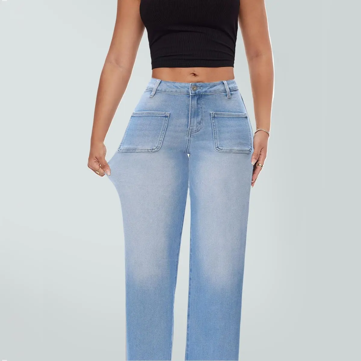 Magic ONESO Front Pocket Design Mid-low Rise Baggy Jeans Stretchy Wide Leg for Women Distressed Pants Light Blue/Dark Blue Womenswear Bottom 8001 Lady Basic Minimalist Comfortable Denim Tummy Control Curve Hugging Plus Size Regular Size BBL