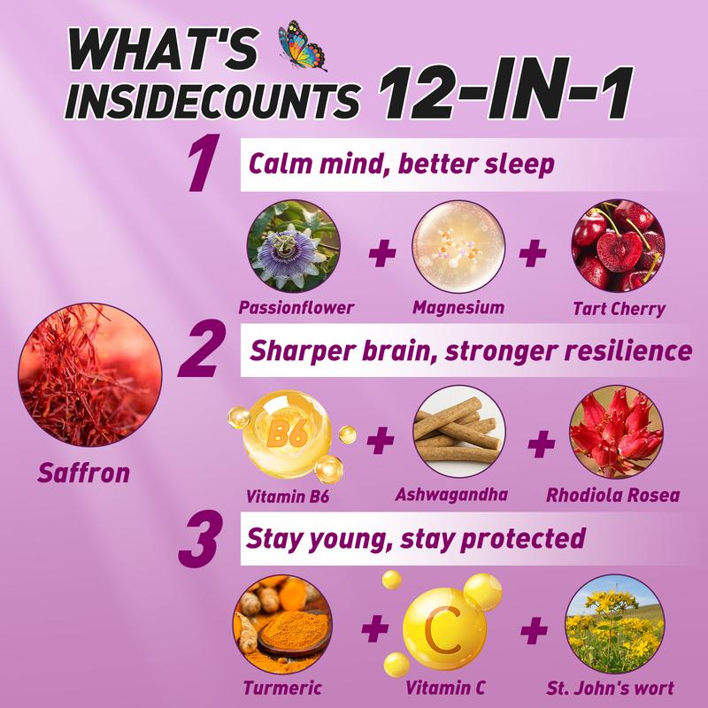 Butterfly's Tear Magic Saffron Gummies 12-in-1 Blend for Brain Health Mood Support & Sleep Aid – 60 Sugar-Free Gummies – Mixed Berry Flavor – Essential Minerals