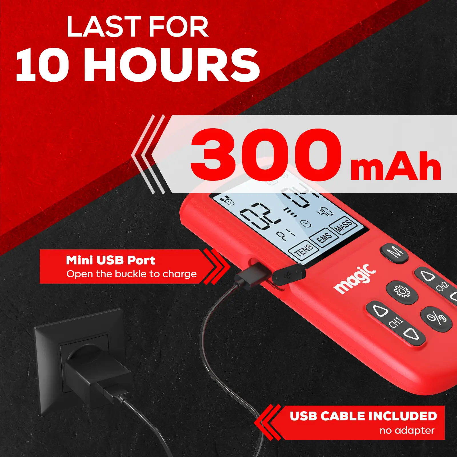 Powerful Battery: Package includes a USB cable (No Adapter) that can be connected to a wall charger, power bank or laptop USB port to charge. One charge provides 10 hours of usage, which is more friendly than AA batteries and lasts longer than other machines. Our Tens Unit with charge level indicator to remind you to charge in time