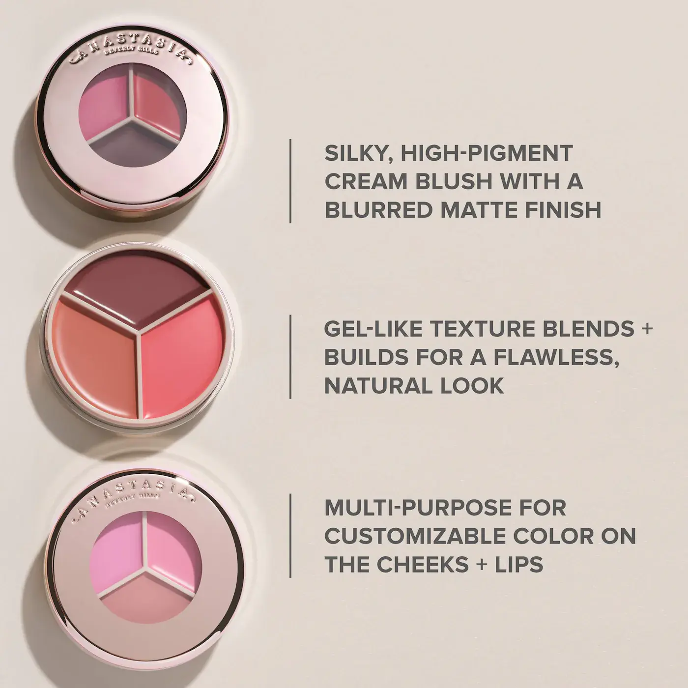 I have used Anastasia Beverly Hills products for years and when she came out with these cream blushes I had to get my hands on it. Perfect colors for spring and summer.