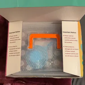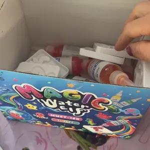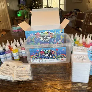 I felt a sand like feel on outer and inner box . Opened and pulled out the plastic container with a spilled sand like material at the top , opened to look and see what it was and turned out to be one of the magic water packets . Ruined a day I planned with my child . 😠