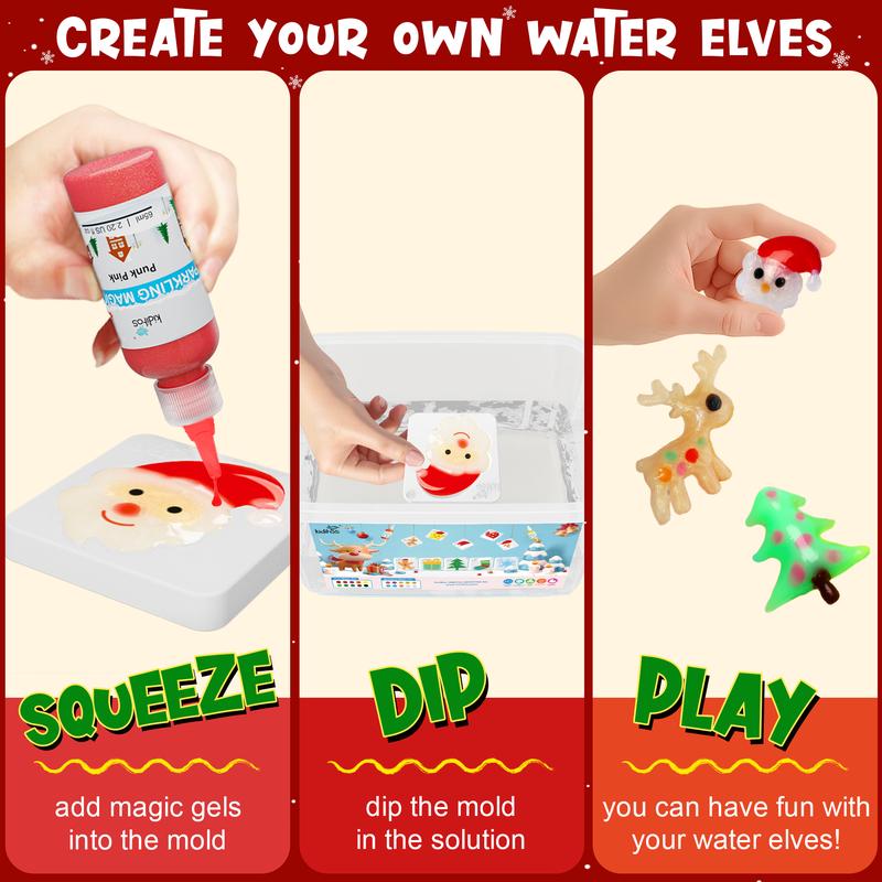 ·Aqua Fairy Water Gel Kit:Designed with bright, eye-catching colors, the Magic Water Elf Kit is excellent for toddlers learning about colors. The variety of Christmas molds enhances cognitive skills through shape and color recognition.