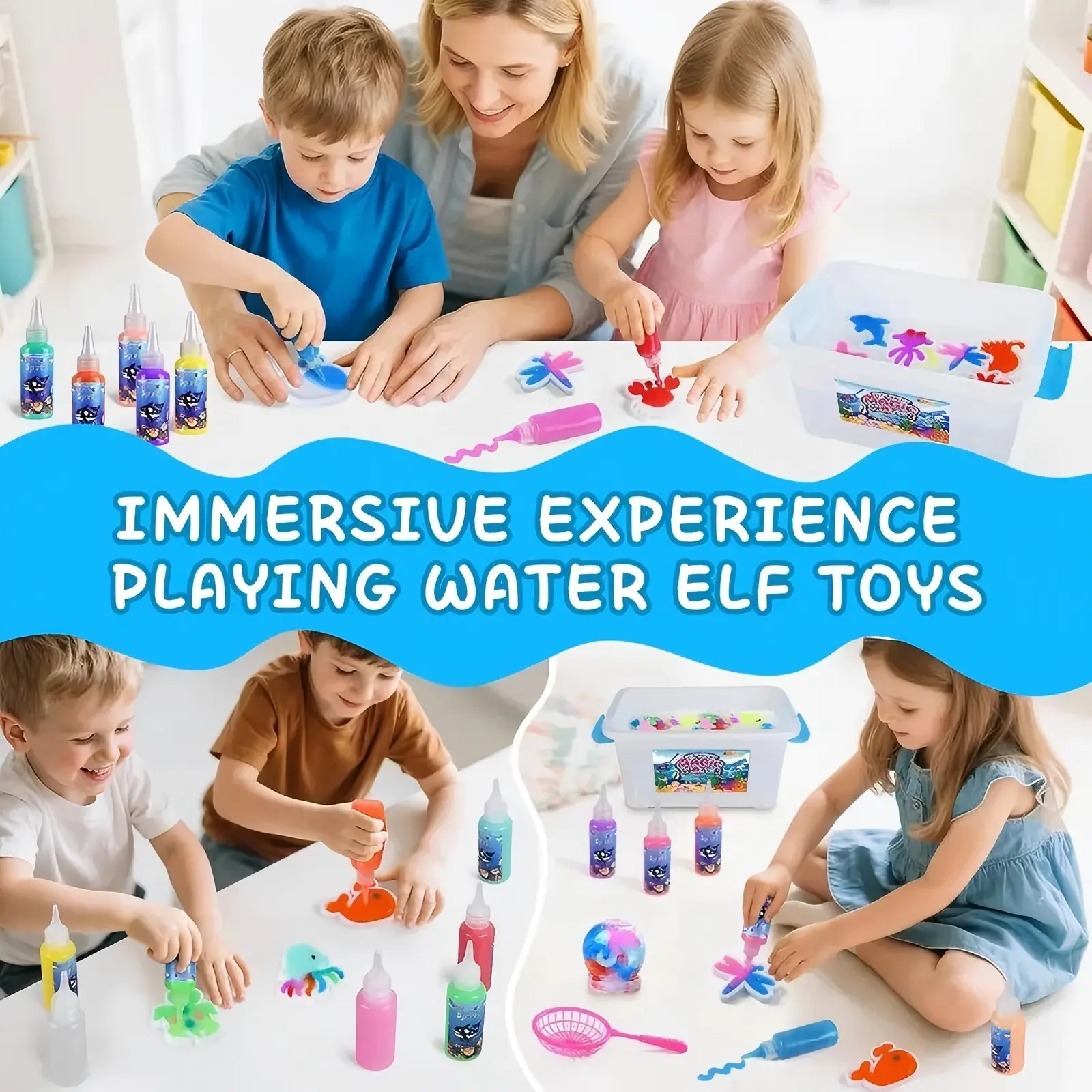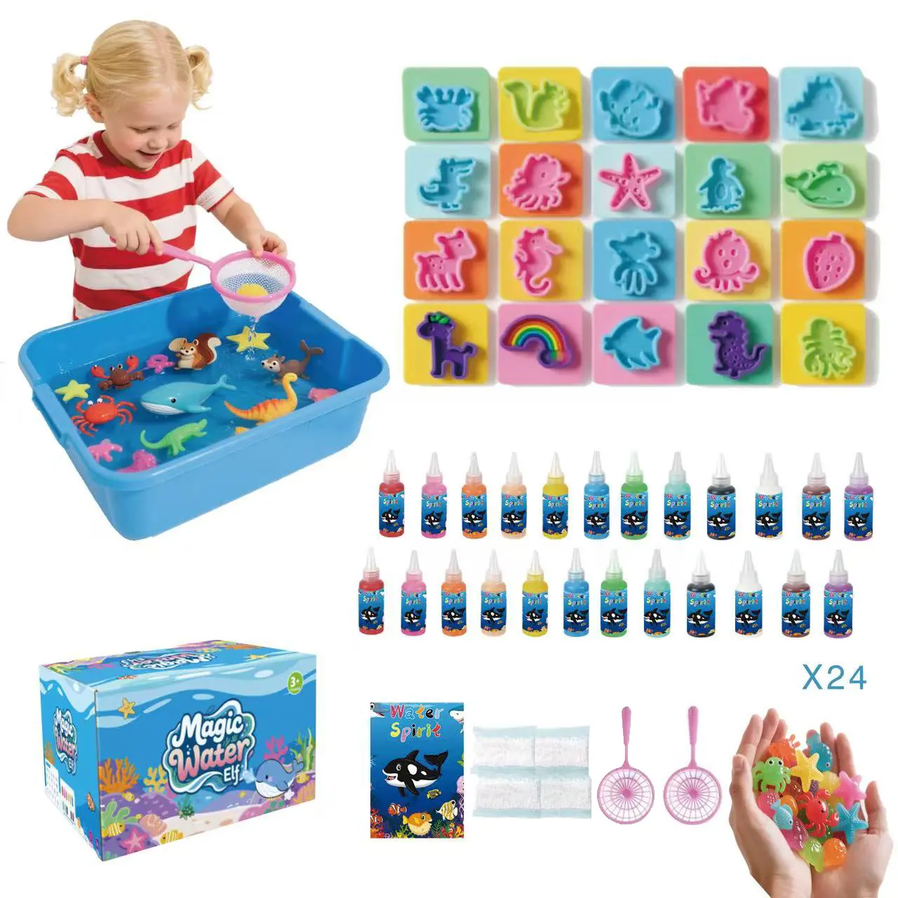 ·Magic Water Elf Toy Kit: This handmade DIY water spirit toy set includes 24 basic color gels, 20 molds, 4 spirit companions, 2 mesh bag, a storage box, instruction manual, and measuring cup—everything you need for endless creative fun!