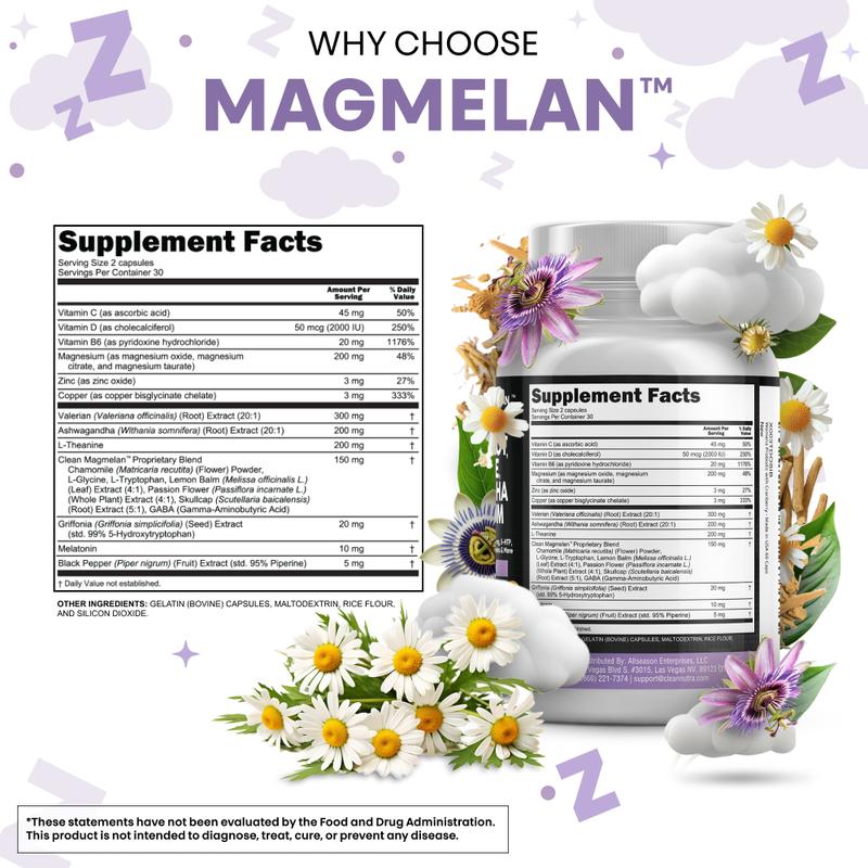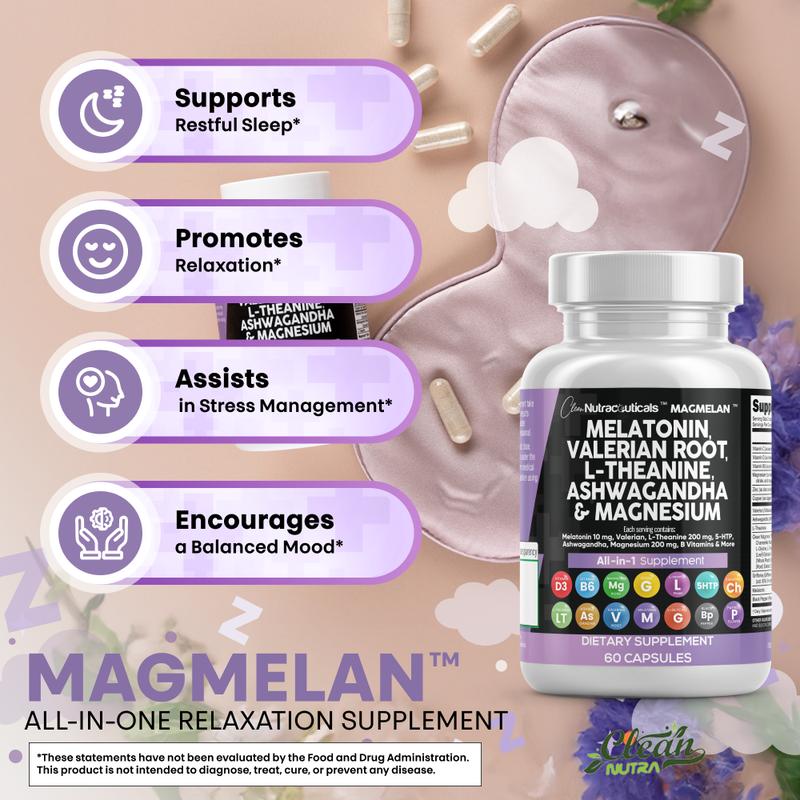 ·The Ultimate L-Theanine 200 mg & Ashwagandha Capsules You've Been Looking For - Clean Nutra MagMelan provides multiple full-dose products in one relaxation support complex containing Magnesium Citrate Capsules, Magnesium Oxide Capsules, Magnesium Taurate Capsules, Ashwagandha Pills, and Valerian Root Herb.