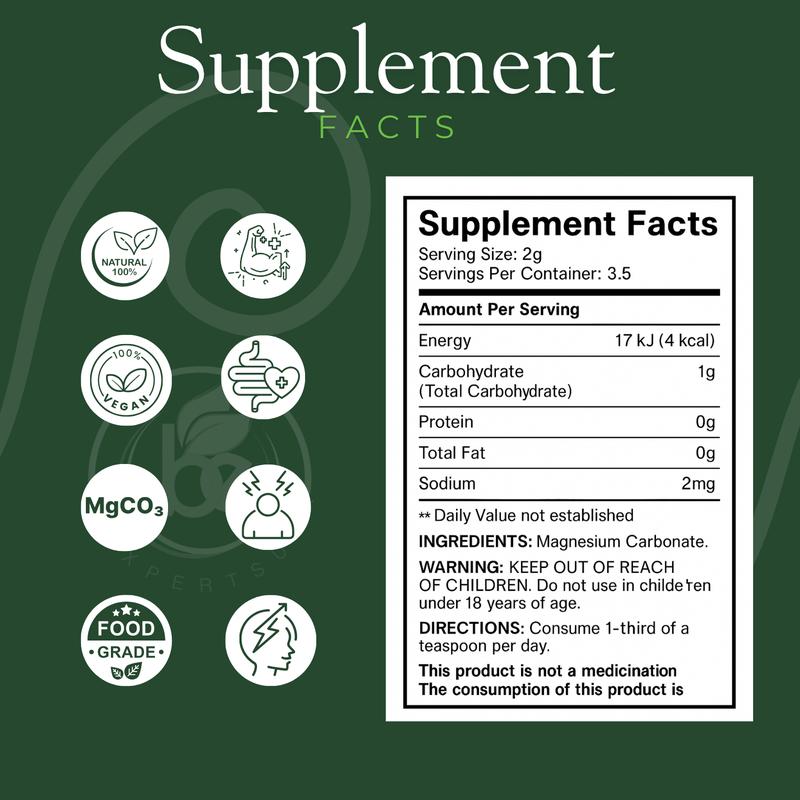 Each serving contains 7 grams of pure magnesium carbonate, crafted in Mexico. The powder is food-grade, ensuring safety and quality.