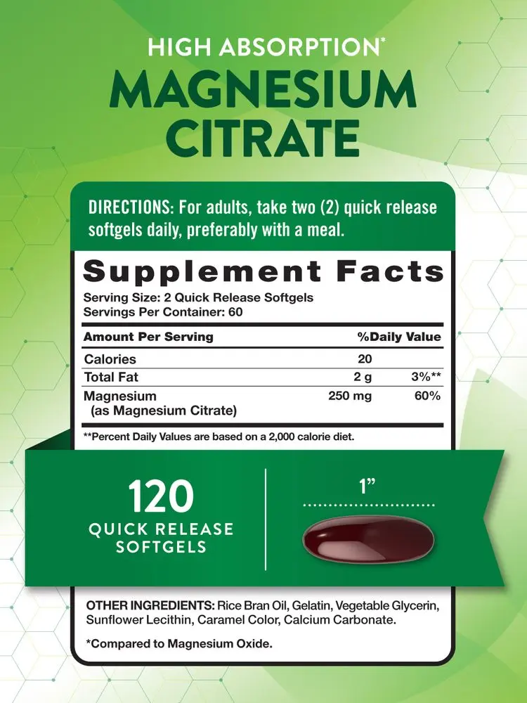 Receive the essential mineral Magnesium in the convenience of two quick release softgels per day. Each serving of this highly absorbable formula delivers 250 mg of Magnesium, as Magnesium Citrate, accounting for 60% of the recommended daily value for adult men and women.*