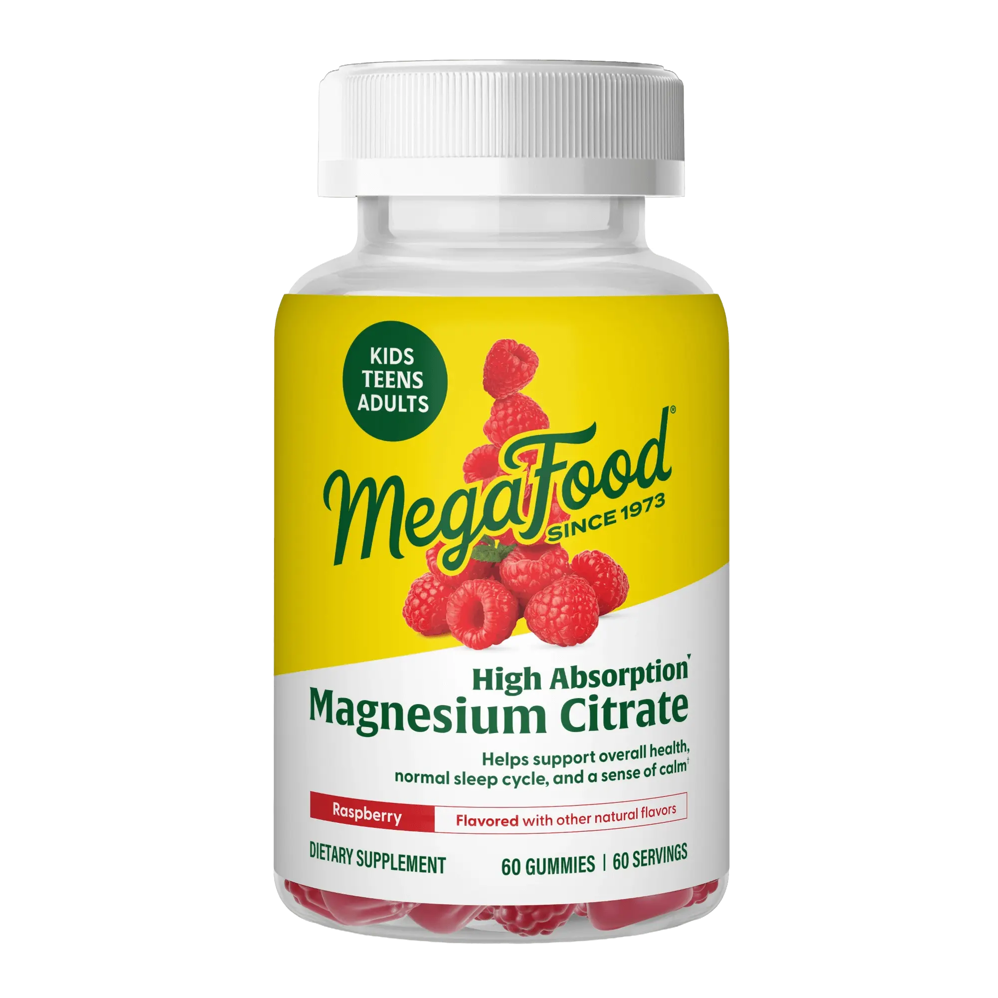 Support daily wellness with delicious raspberry-flavored Magnesium Citrate Gummies from MegaFood. Each gummy delivers 100 mg of highly absorbable Magnesium Citrate, known for superior absorption compared to magnesium oxide. Formulated for kids ages 4 and up, teens, and adults, these gummies support muscle function, normal sleep cycle, and nerve, heart & bone health; This formula also helps promote a sense of calm and may help with occasional muscle cramping.*