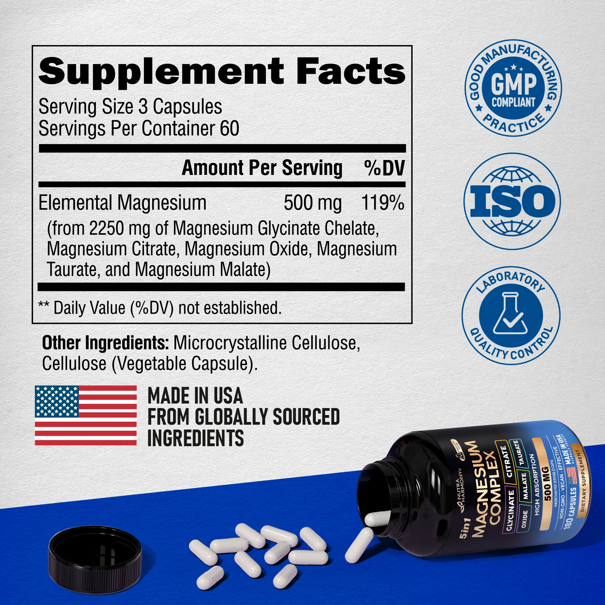 ·500 mg Magnesium — The 2250 mg of Magnesium complex delivers 500 mg of Elemental Magnesium, which is 119% DV to replenish deficiencies & support Magnesium levels!