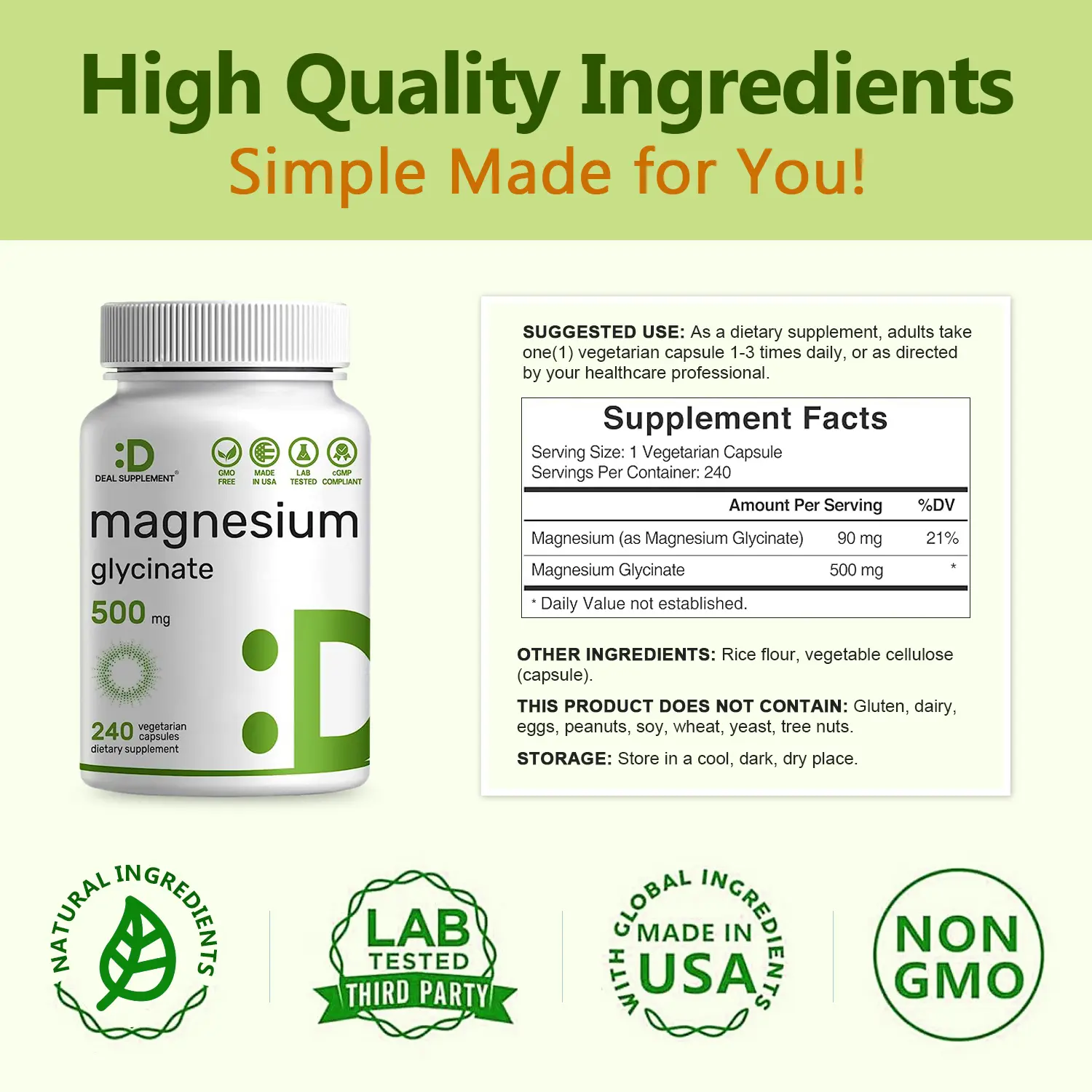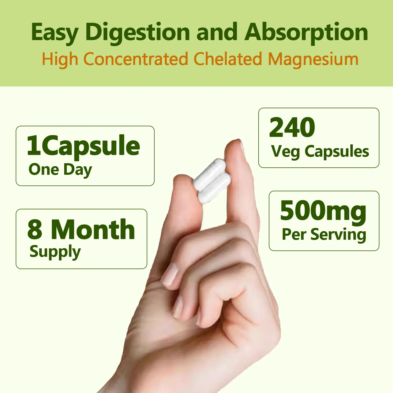 ·Dosage & Servings – Only 1 vegetarian capsule per serving to receive 500mg of pure magnesium glycinate. Each bottle offers 240* veg capsules and up to an 8-month supply.