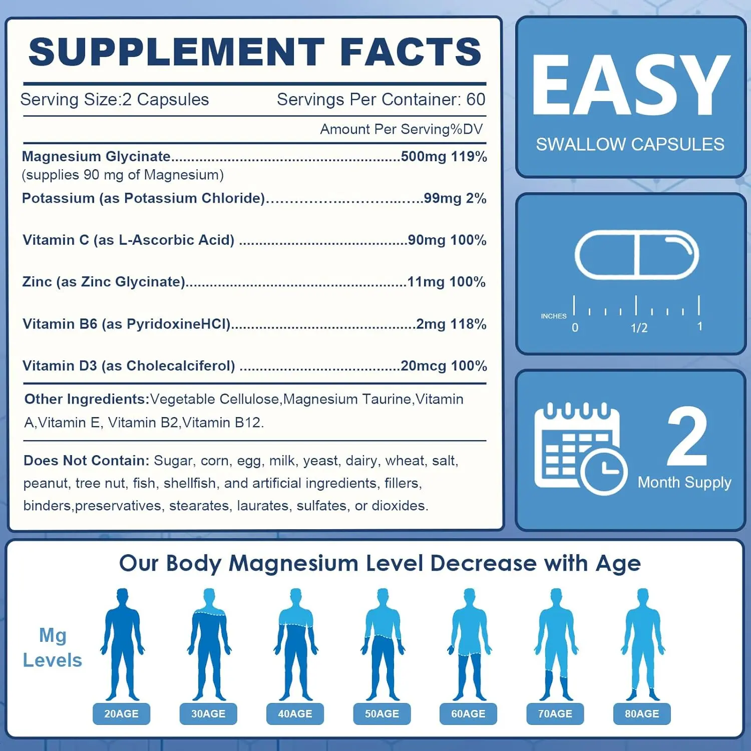 NATURE TARGET Magnesium Glycinate supplement with 500mg magnesium per serving, total of 120 veggie capsules for 60 days serving supply. We combine Magnesium, Potassium, Zinc, Vitamin C, B6, D3, and other Multivitamins in one tiny capsule.