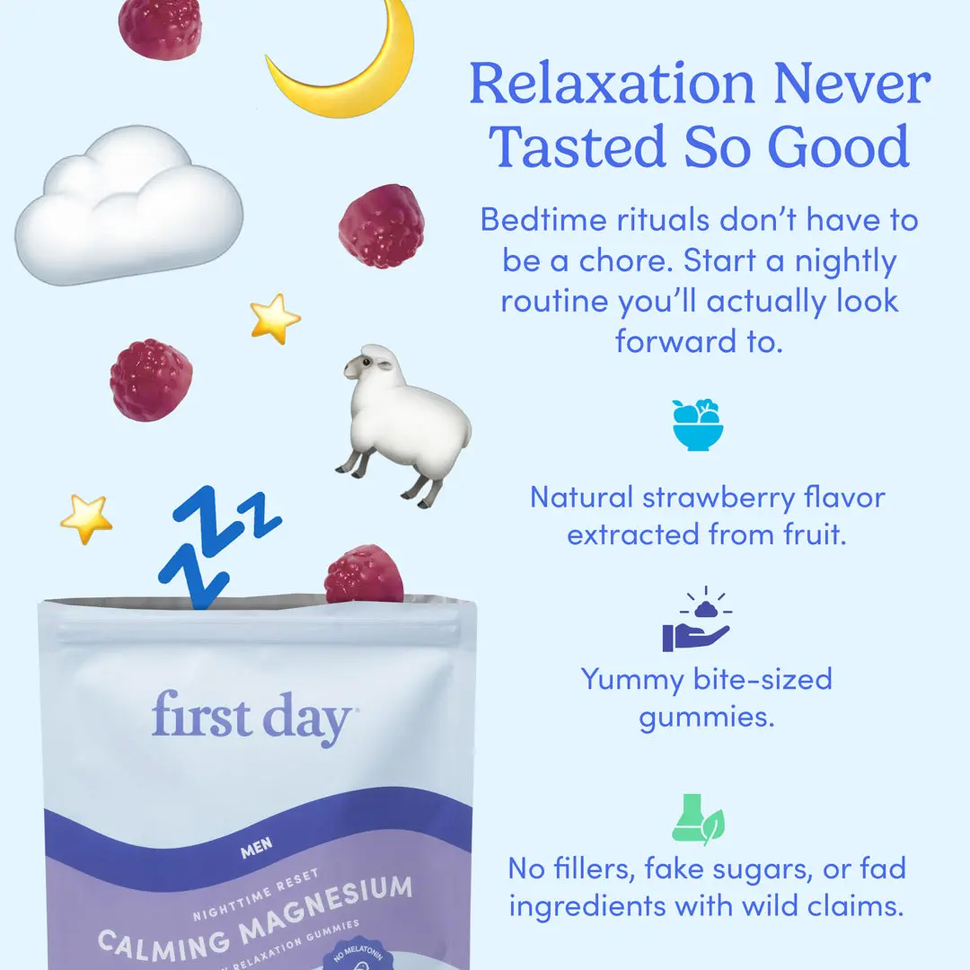 Which is why getting your magnesium levels up are key to restful nights and energized days. Introducing Mens’ Nighttime Reset – a calming magnesium gummy that’s hormone-free.