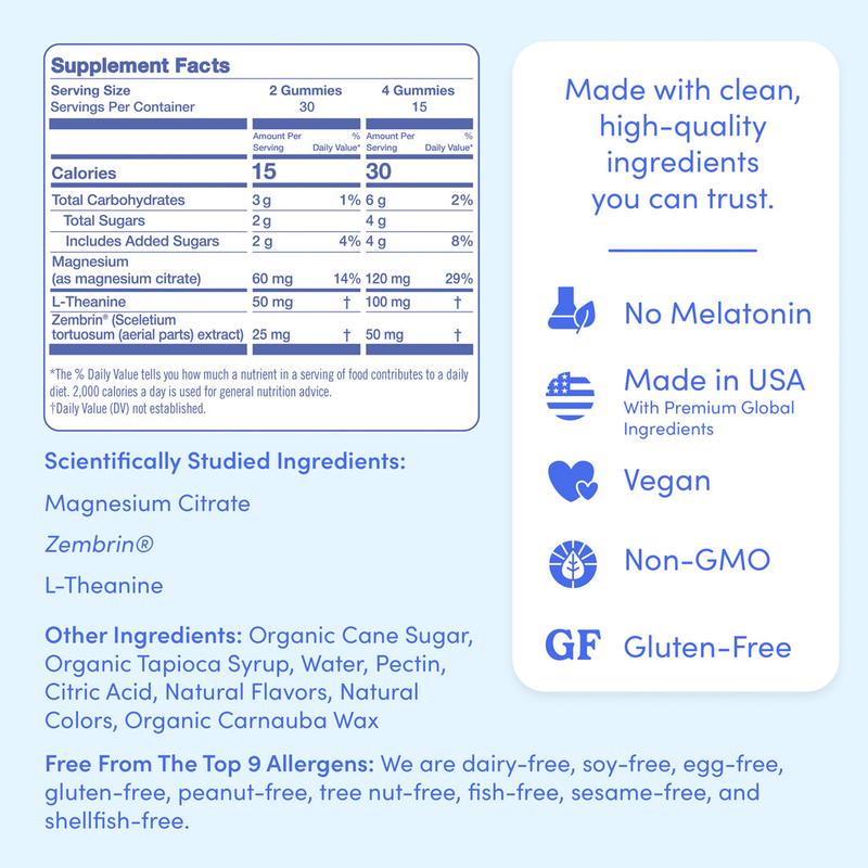 Magnesium Citrate: An essential mineral that supports mind and body relaxation, balances mood, and supports nighttime relaxation. We use a 100% chelated format that is more bioavailable, for maximum absorption.