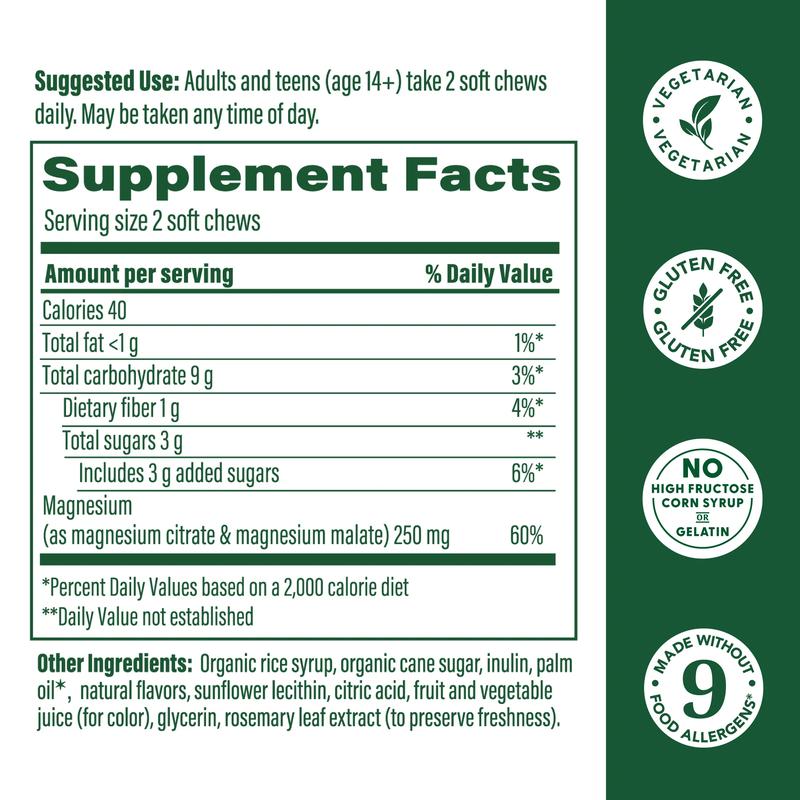 Each chew is made with a combination of highly absorbable Malate and Citrate to offer 250 mg of magnesium and 3 g of sugar per two chew serving.