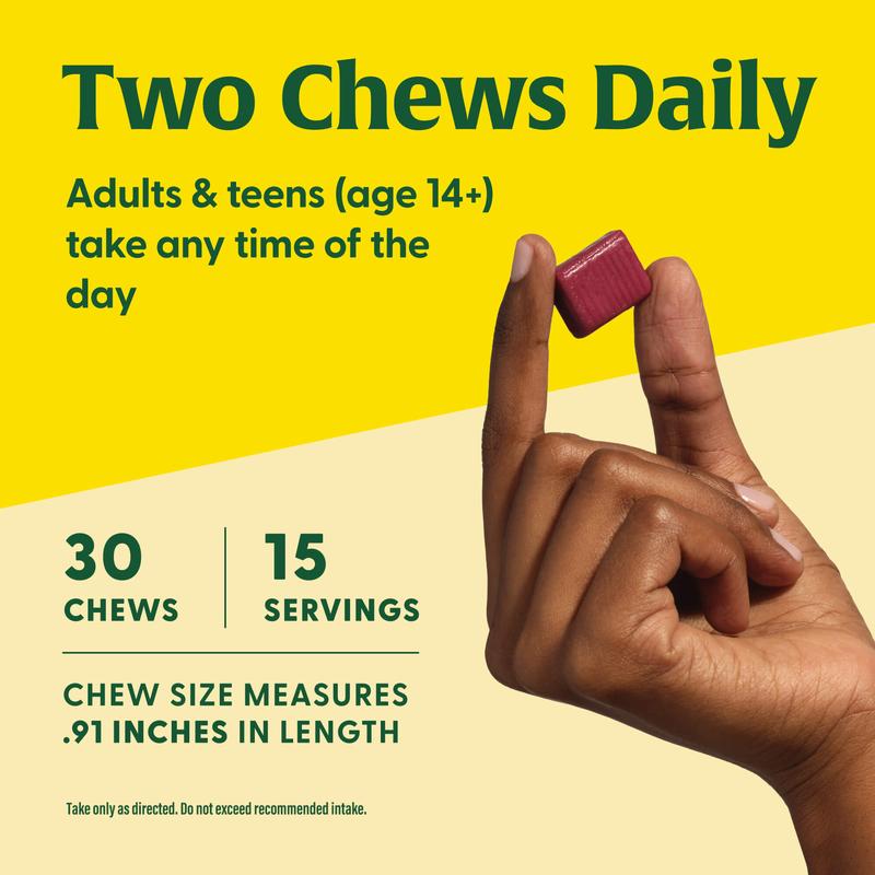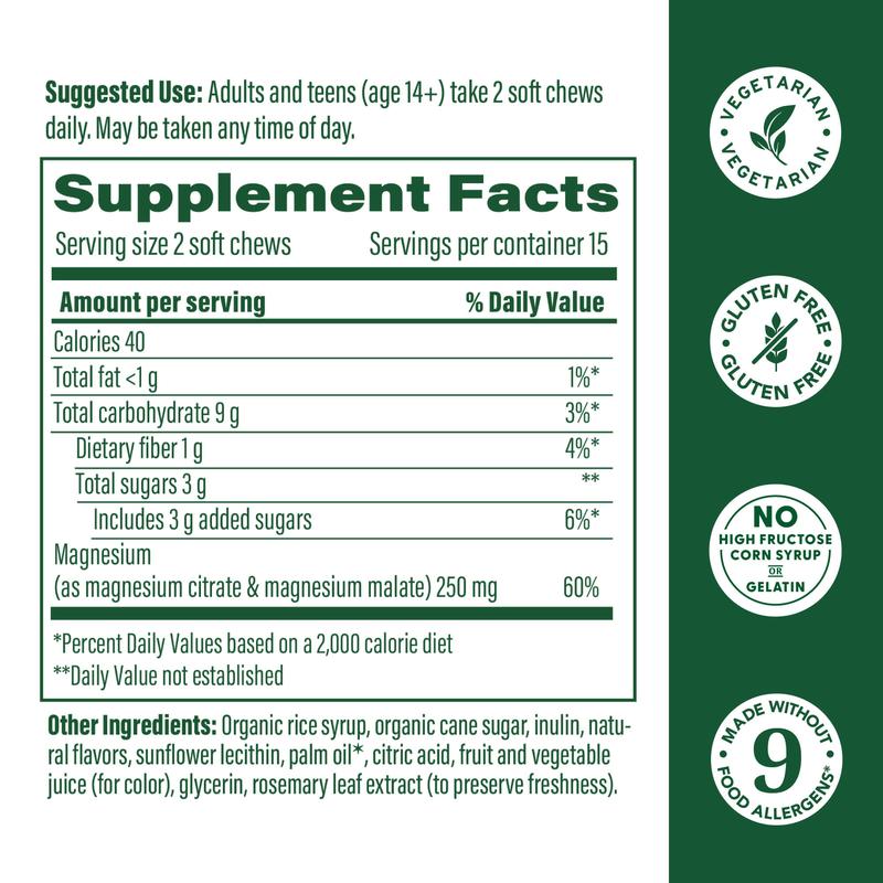 Each chew is made with a combination of highly absorbable Malate and Citrate to offer 250 mg of magnesium and 3 g of sugar per two chew serving.