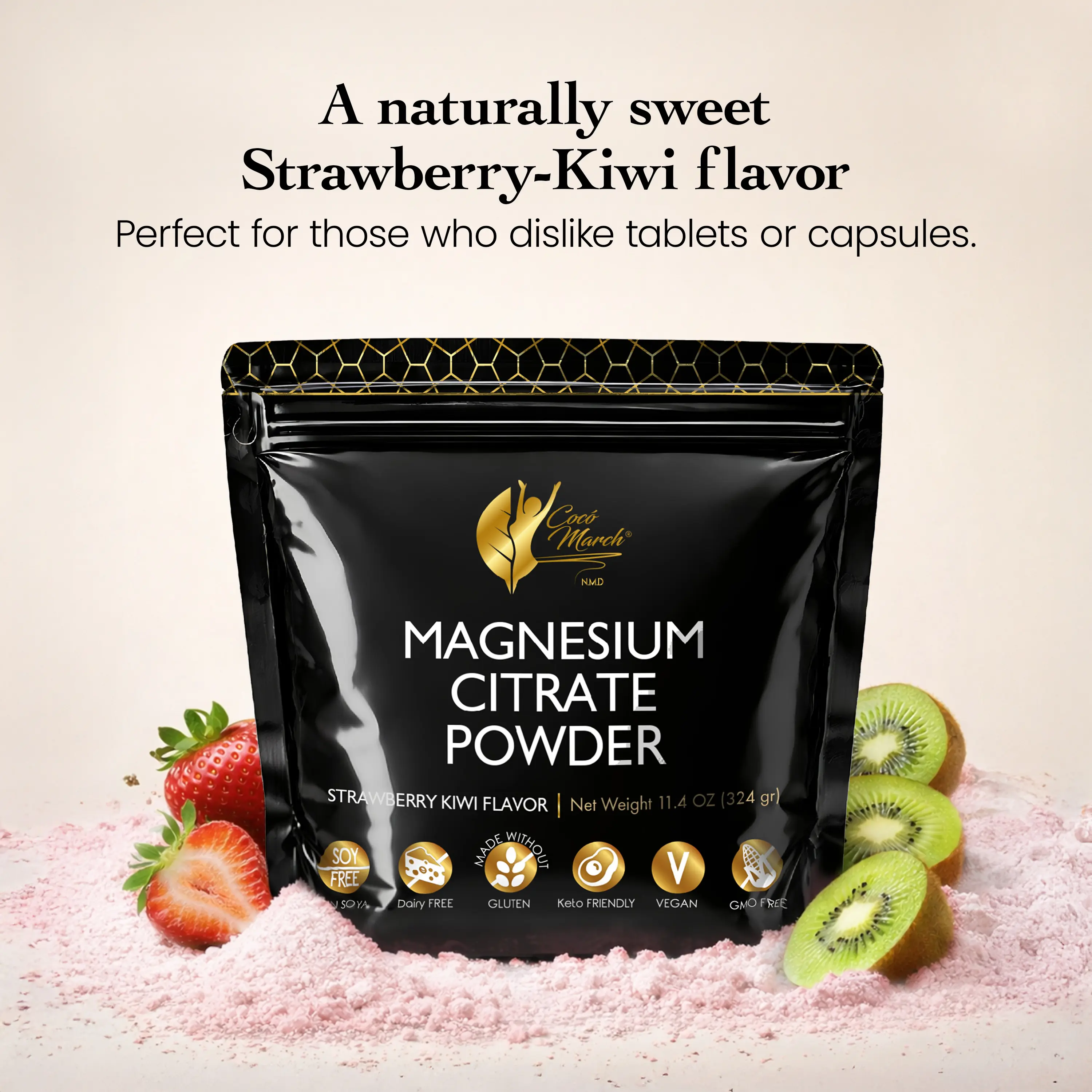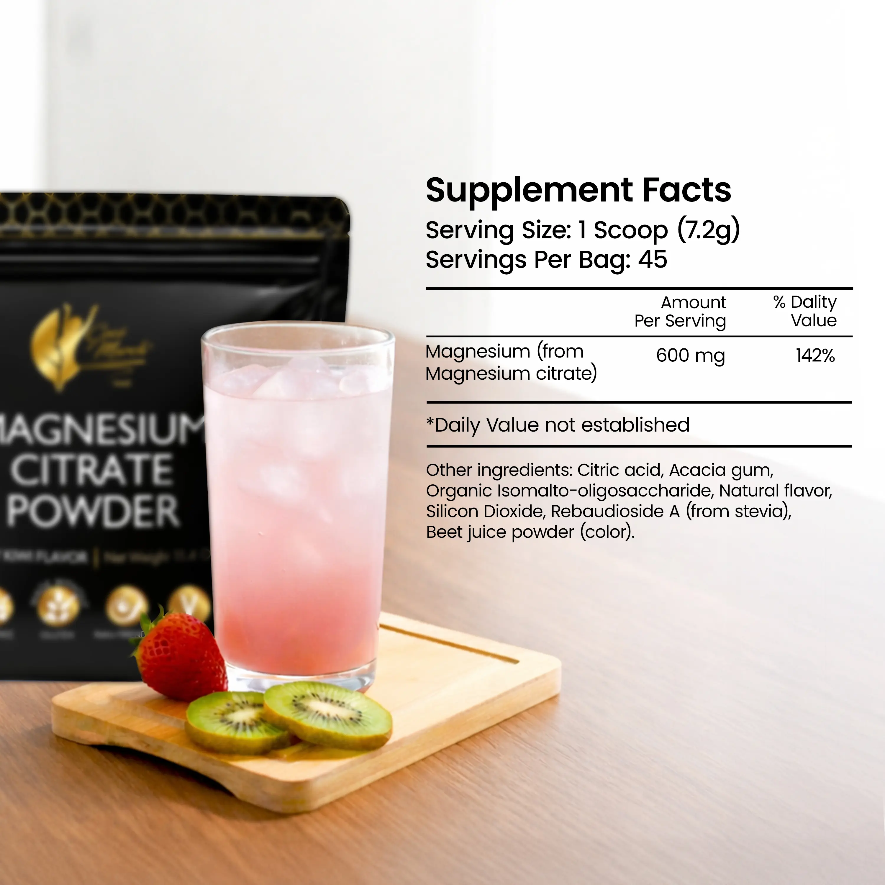 A delicious, fast-dissolving magnesium supplement crafted with highly absorbable Magnesium Citrate to support bone health, muscle function, relaxation, and overall wellness. With 600 mg of magnesium citrate per scoop and a refreshing strawberry kiwi flavor, this powder offers an easy, flavorful alternative to tablets or capsules.