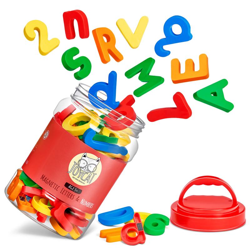 ·JoyCat educational toy provides 78 PCS Magnetic Letters & Numbers, includes 26 uppercase letters, 26 lowercase letters, 20 numbers and 6 math symbols, all packed in a plastic bucket that you can take anywhere. Fridge magnets set come in five advanced colors.