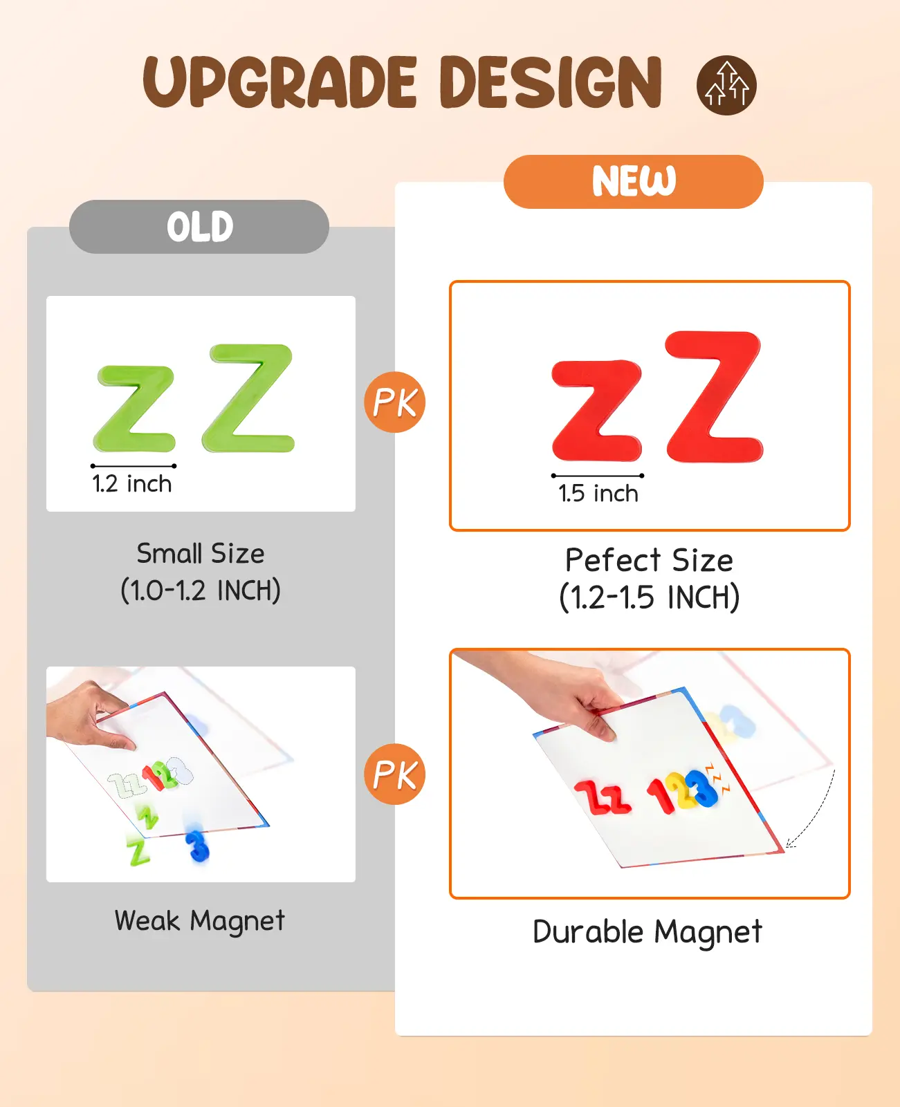 ·Our magnetic alphabet letters and numbers have increased the size of the letters to 1.2in -1.5in with a more advanced matte texture. We also upgrade the magnet to make it more durable and not easy to fall off, all for long-term use.