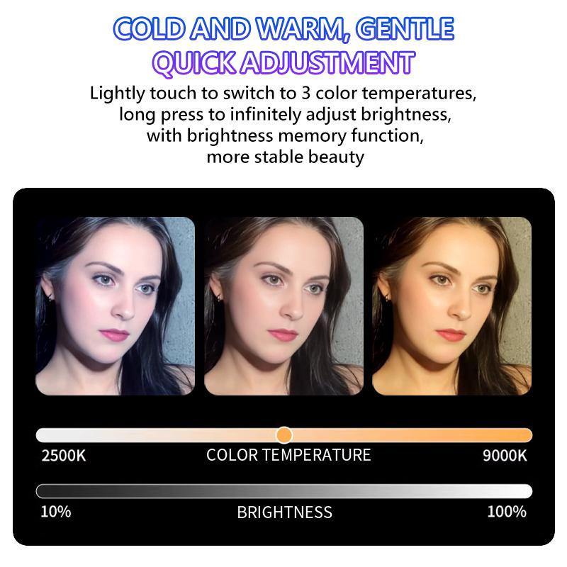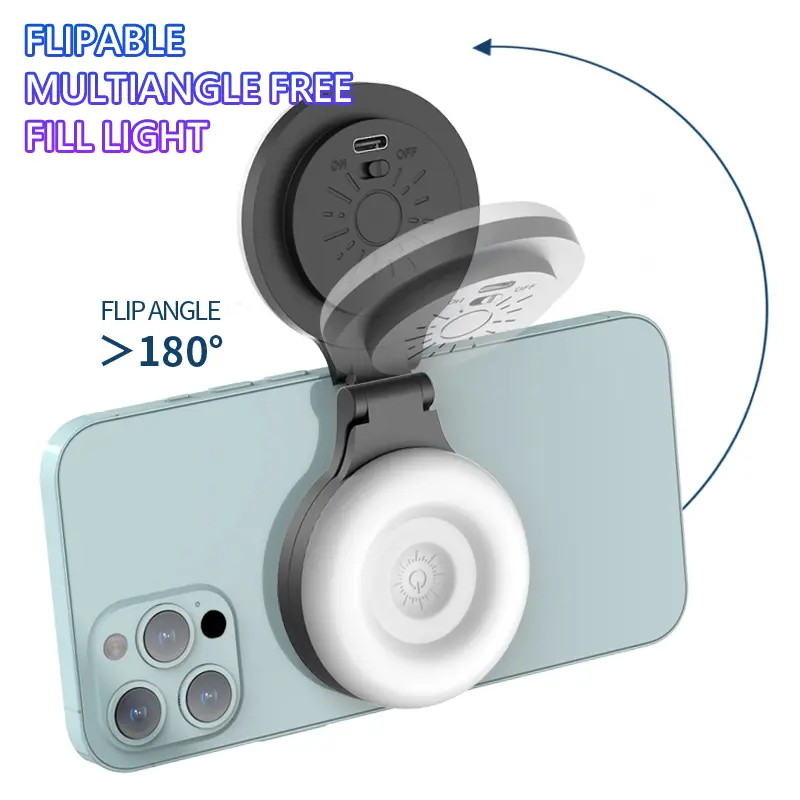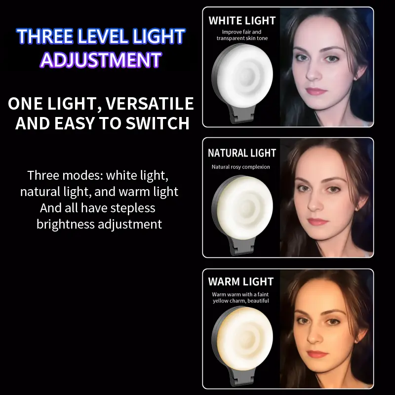 This attachable ring light offers three distinct lighting options (warm, natural, and cool white), each featuring three-stage dimming settings. Effortlessly tailor the color temperature (2500K–9000K) to suit diverse lighting conditions. Ideal for video calls, self-portraits, live streaming, and vlogging content creation. Secures magnetically.