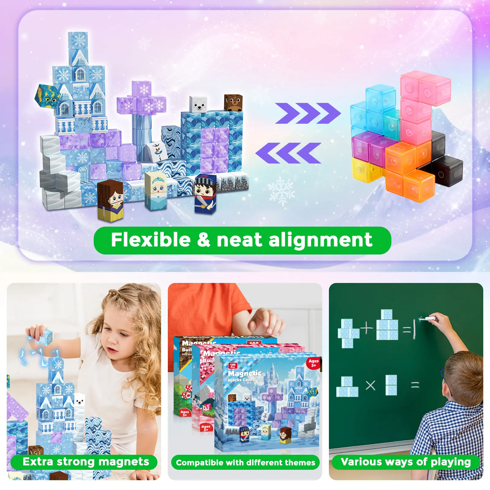 ·【 Build Frozen Castle Magnetic Cube Kit】Including 100 magnetic cubes in 16 colors. Idea booklet with the storyline and beautiful patterns, keep them busy in clever ways. Graceduck magnetic activity cubes are made of high-quality ABS material and crafted with round edges and the right size. Our magnetic cubes kit with super strong internal magnetic, which is easier for toddlers ages 3+ to stick the cubes together and make builds sturdy. Perfect STEM toys help kids gain a deeper understanding of the structure and learn about magnetic properties!