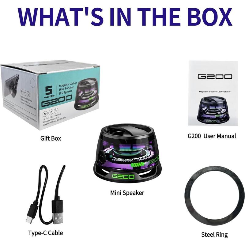 Ever wished your mini speaker could stick right to your phone and also hold it up for hands-free fun? Meet the G200 Magnetic Bluetooth Speaker! This compact gadget magnetically attaches to your phone or any metal surface, doubling as a phone stand for watching videos, scrolling TikTok, or gaming sessions. Packed with a 40mm dynamic driver, it pumps out 5W of rich, powerful stereo sound with deep bass that truly immerses you. The transparent design glows with vibrant RGB lights, adding a cool visual vibe that syncs perfectly with your music or game mode. Thanks to Bluetooth 5.3, pairing is a breeze and the connection stays strong within 33 feet. It’s fully compatible with iPhone 12 through 15 models, including Mini, Pro, and Max versions, and works with other smartphones using the metal ring. Whether you’re gaming, chatting, or just jamming out, the G200 keeps things fun and hands-free. Grab yours and elevate your audio experience with style and convenience!