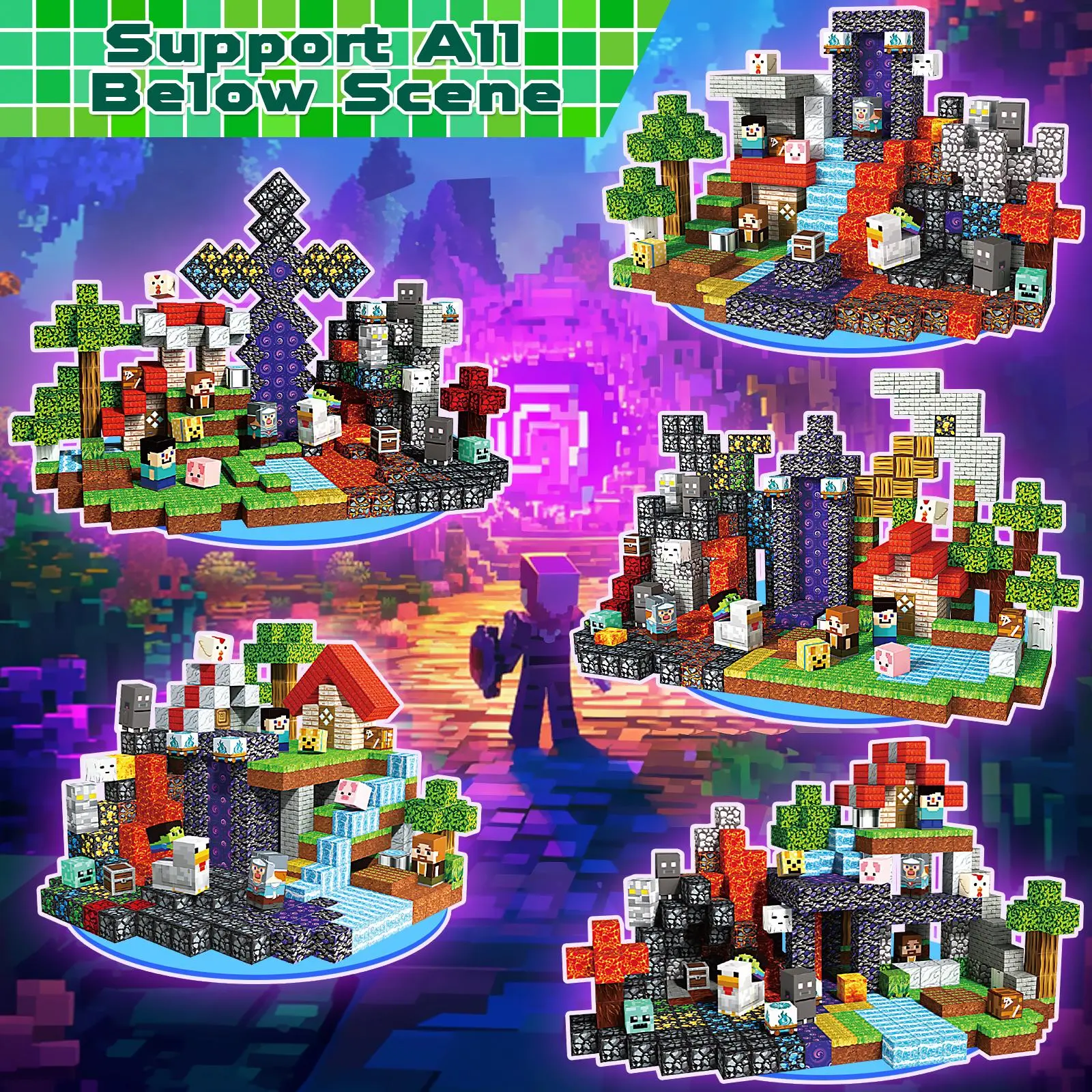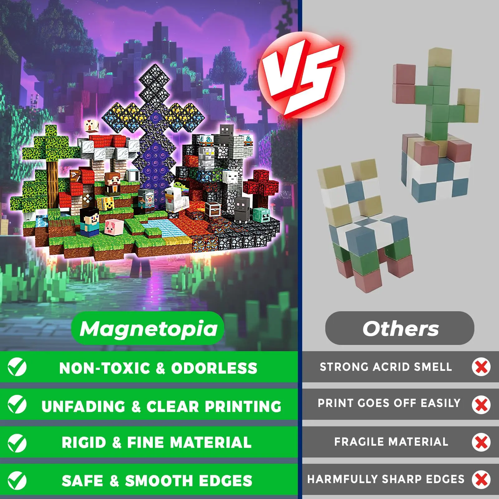 【Interactive & Entertaining】 The magnetic building blocks set includes an instruction manual paper and 14 different patterns blocks. These magnetic blocks for kids can build structures, and scenes with these magnetic toys. Each cube connects easily for unlimited stacking and construction variations.