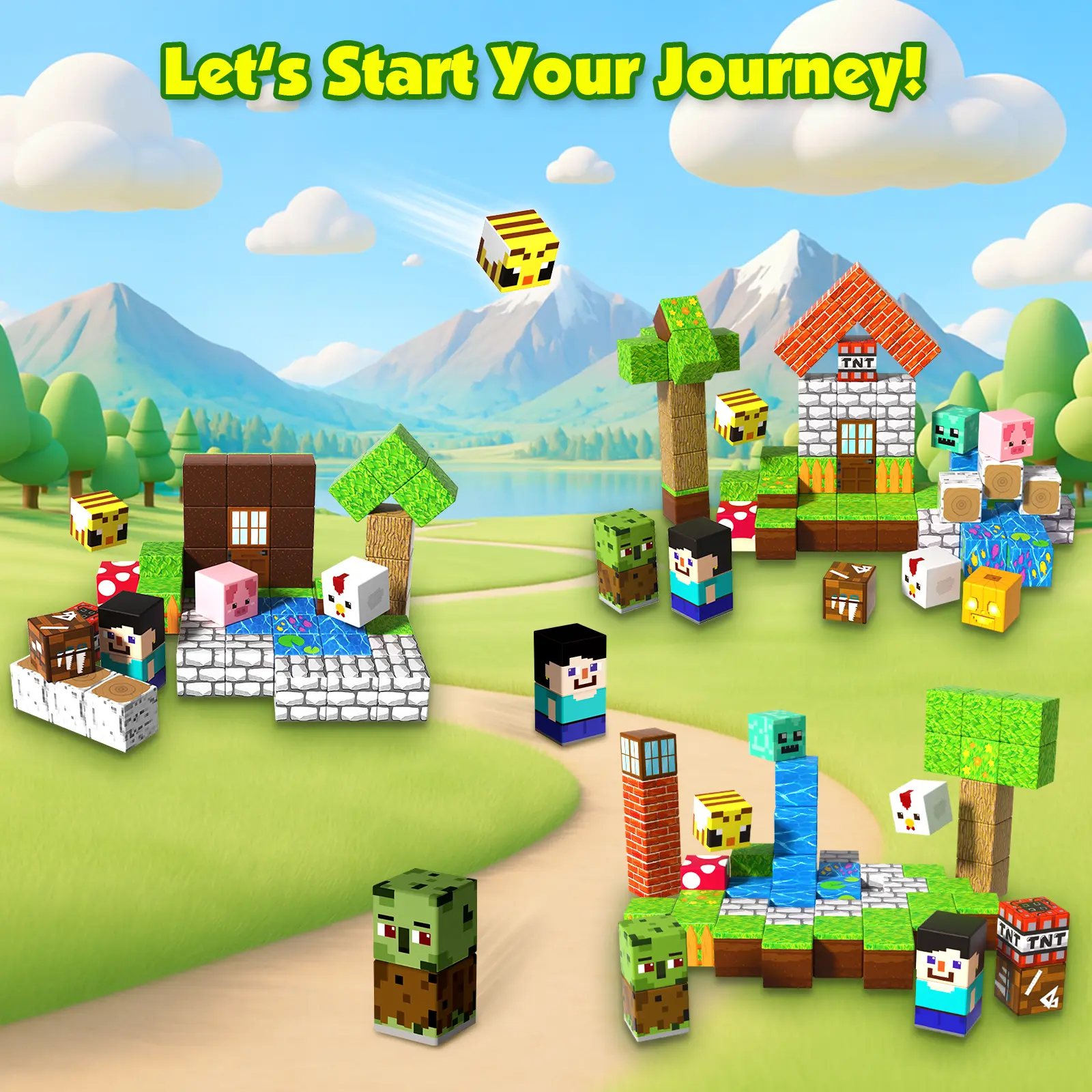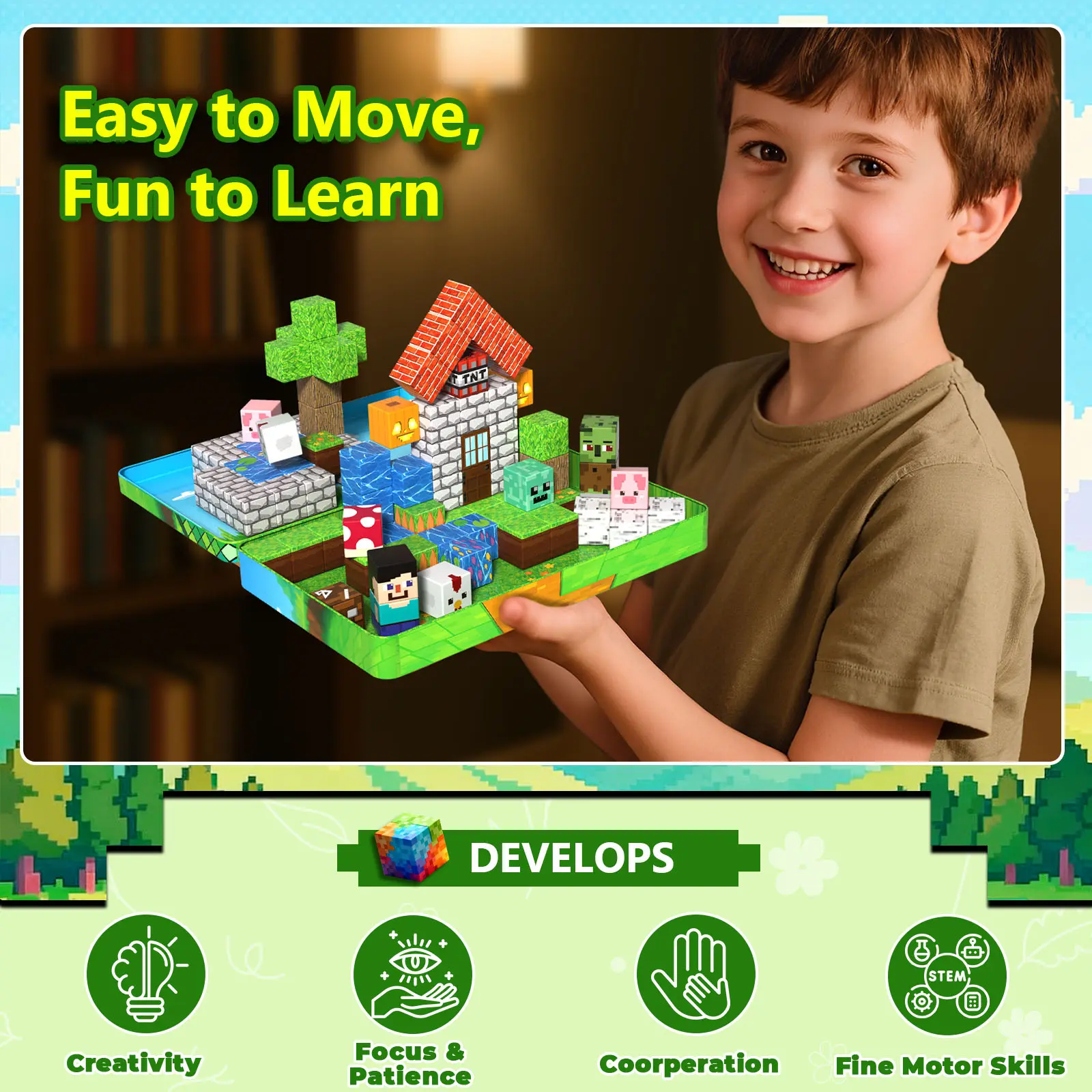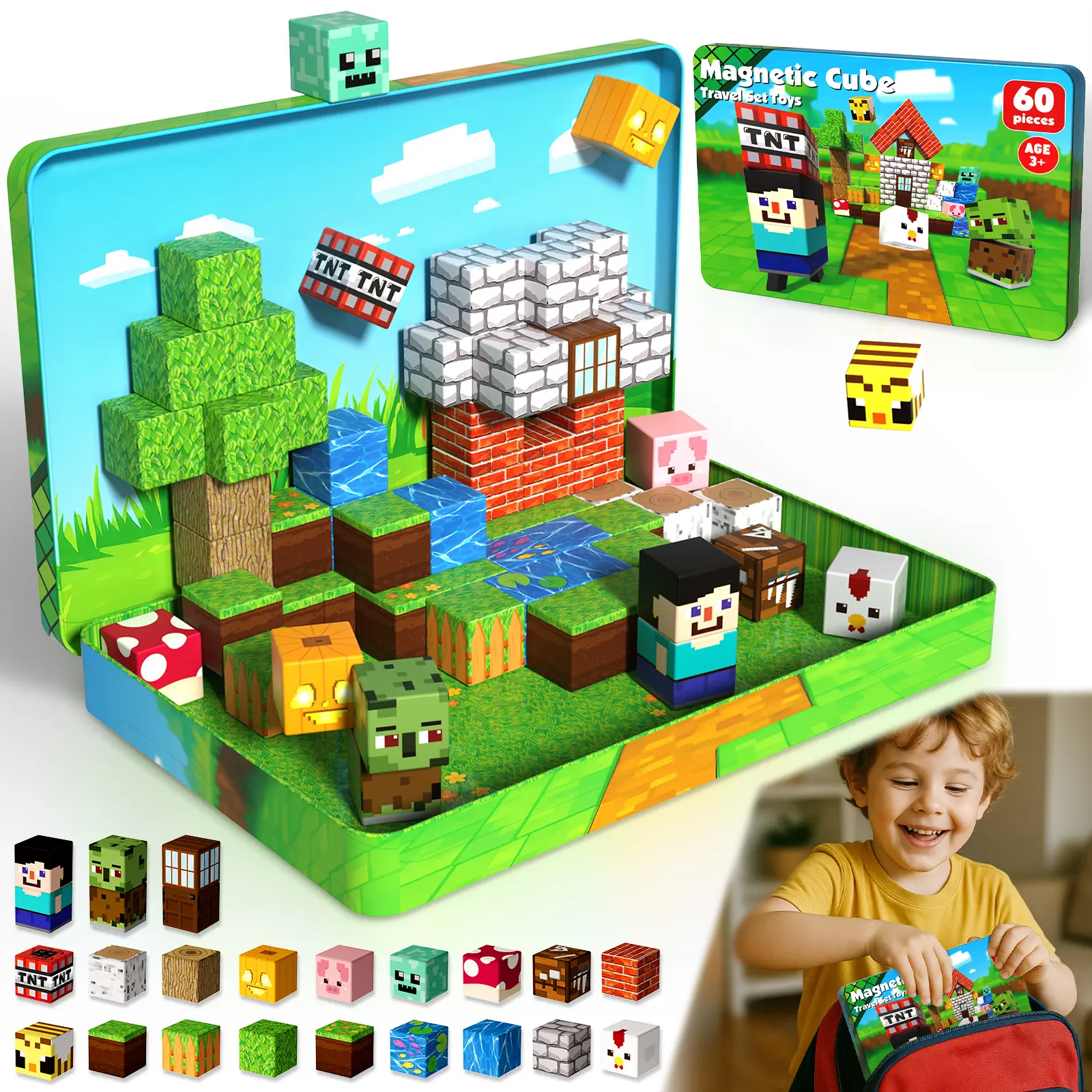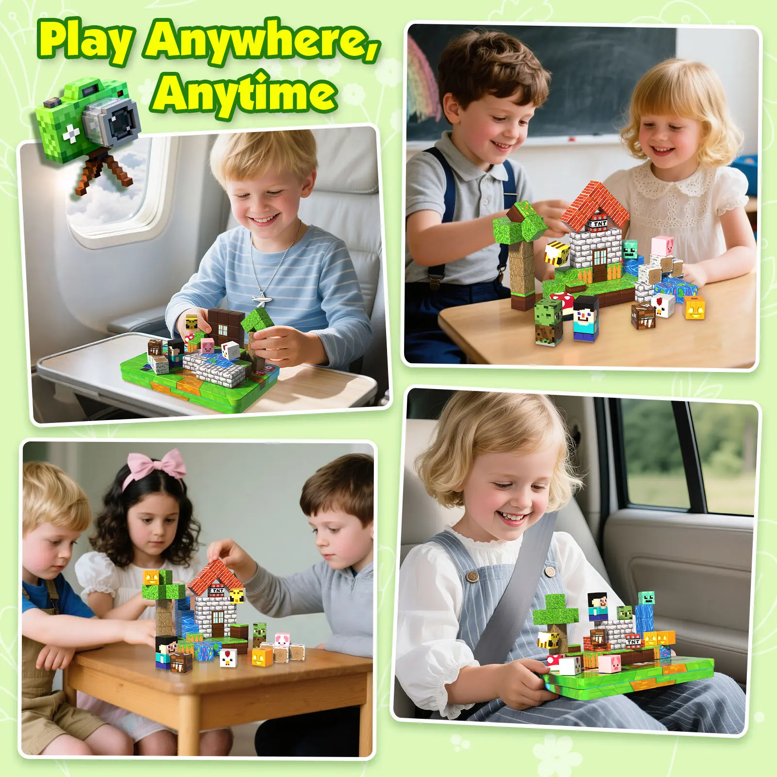 【 60PCS Travel Set Magnetic Blocks】Includeing 60 magnetic cubes in 20 unique designs with bright colors, kids can combine elements like water, brick houses, grassy fields, and small characters to create playful scenes. Compatible with most other sets, these magnetic blocks let children naturally develop imagination, spatial awareness, design thinking, and problem-solving skills as they play.