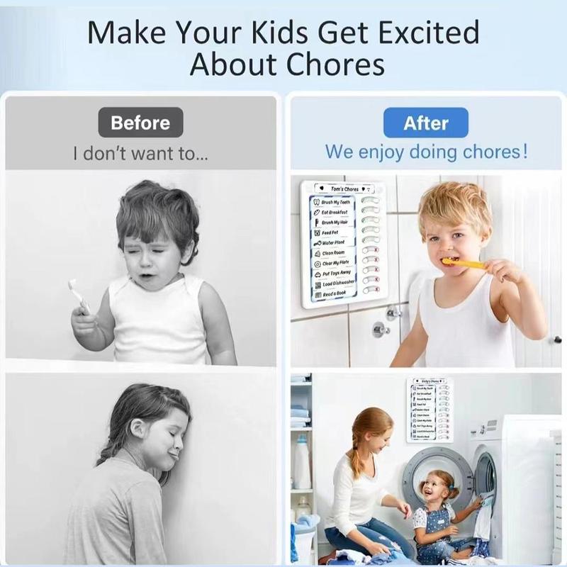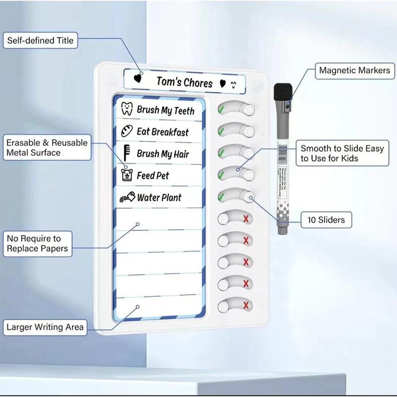 This is the easiest way to track the chores my kids do as well as teach them some responsibility. Great size, magnetic or can stand on its own with a retractable stand, dry-erase board to update when needed. LOVE!