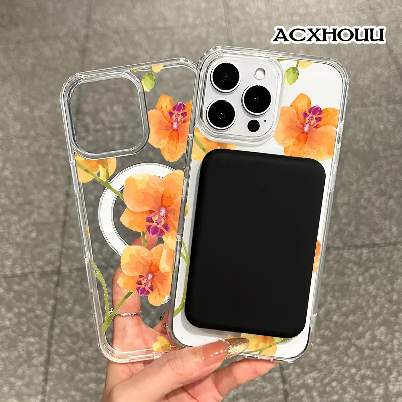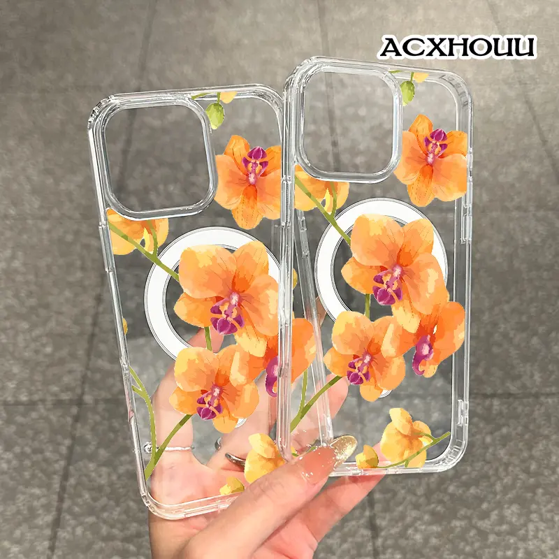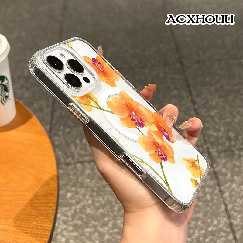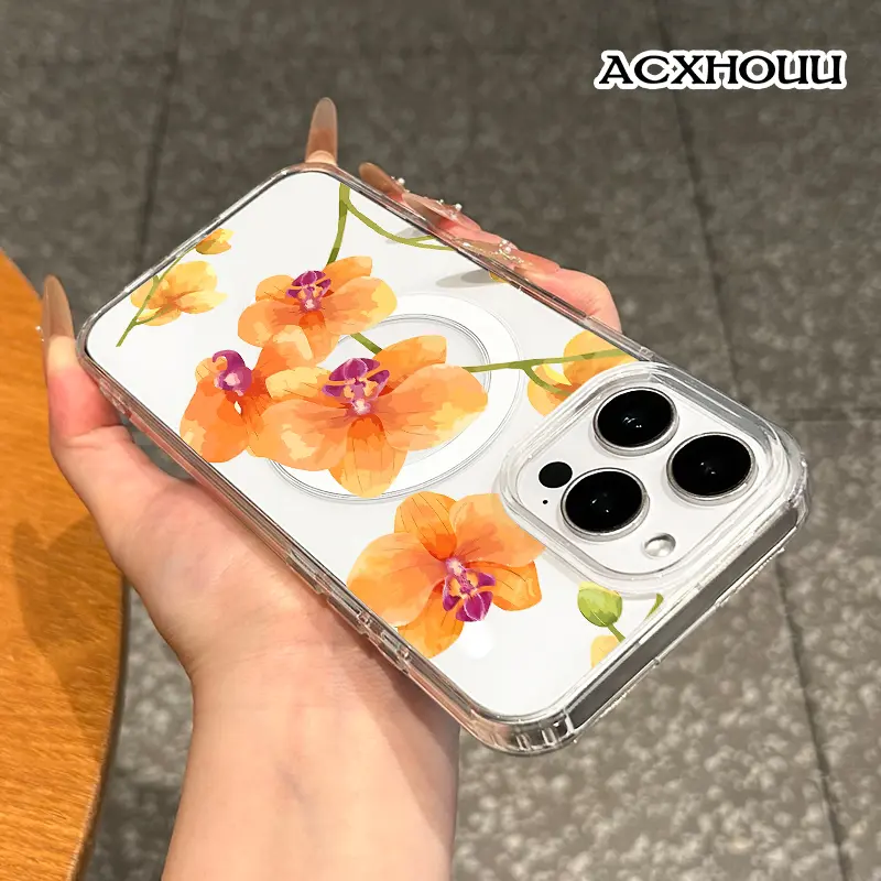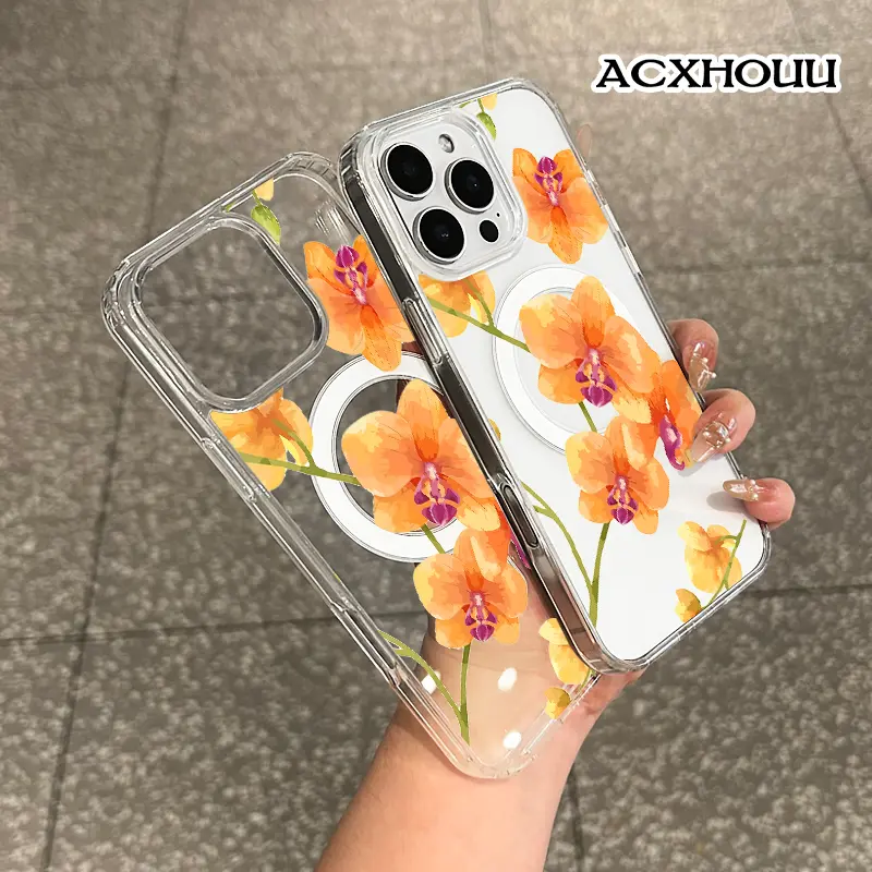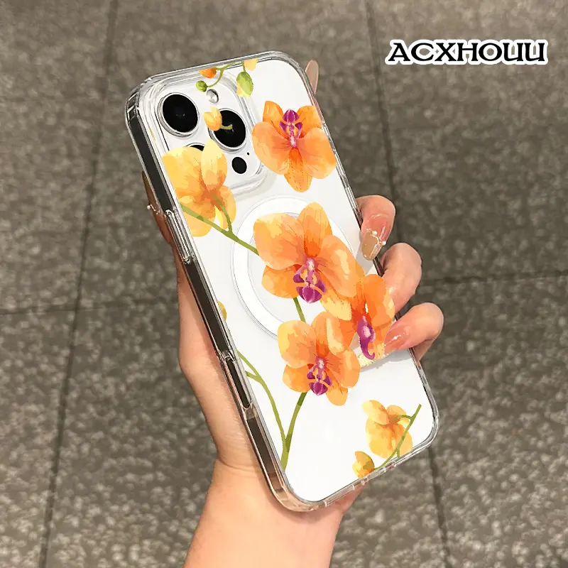 Magnetic Compatible Case for iPhone 16 E Pro Max 15 Plus 14 13 12 11 XS XR, Cute Orange Orchid Watercolor Design | Shockproof, Stylish, Girly, Scratch Resistant, and Silicone Protection