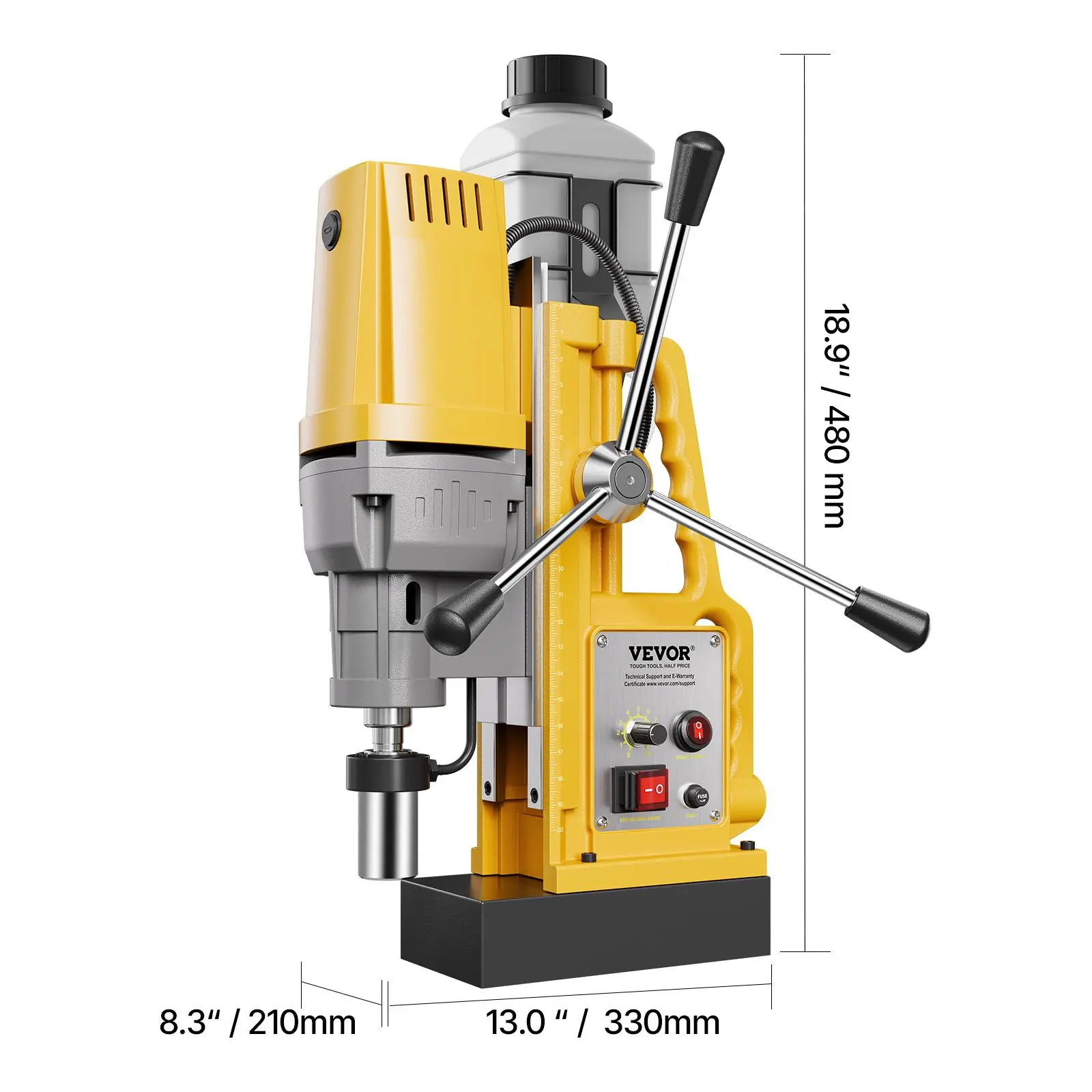 • Understand the Power: 2922 lbf / 13000 N of robust force is created by the electromagnetic thickened base, featuring pure iron anchors the mag drill press solidly works at any angle stably during the drilling process. Adjustable 10-speed gears achieve accurate and efficient operation according to different drilling diameter