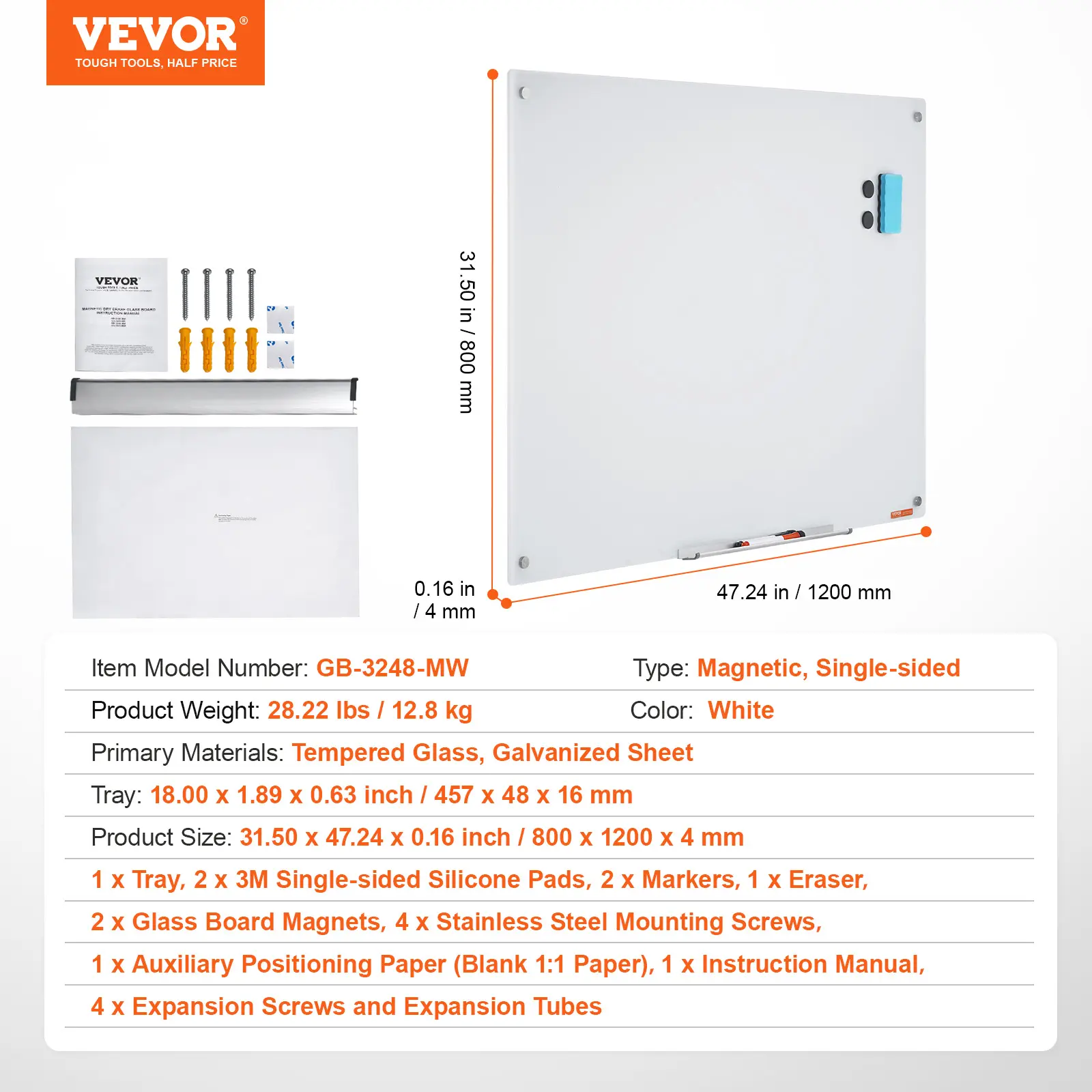 • Effortless Installation: No hassle installation, thanks to included positioning paper and stainless steel screws. Mounting is quick and convenient, requiring no lifting of the glass dry erase board.