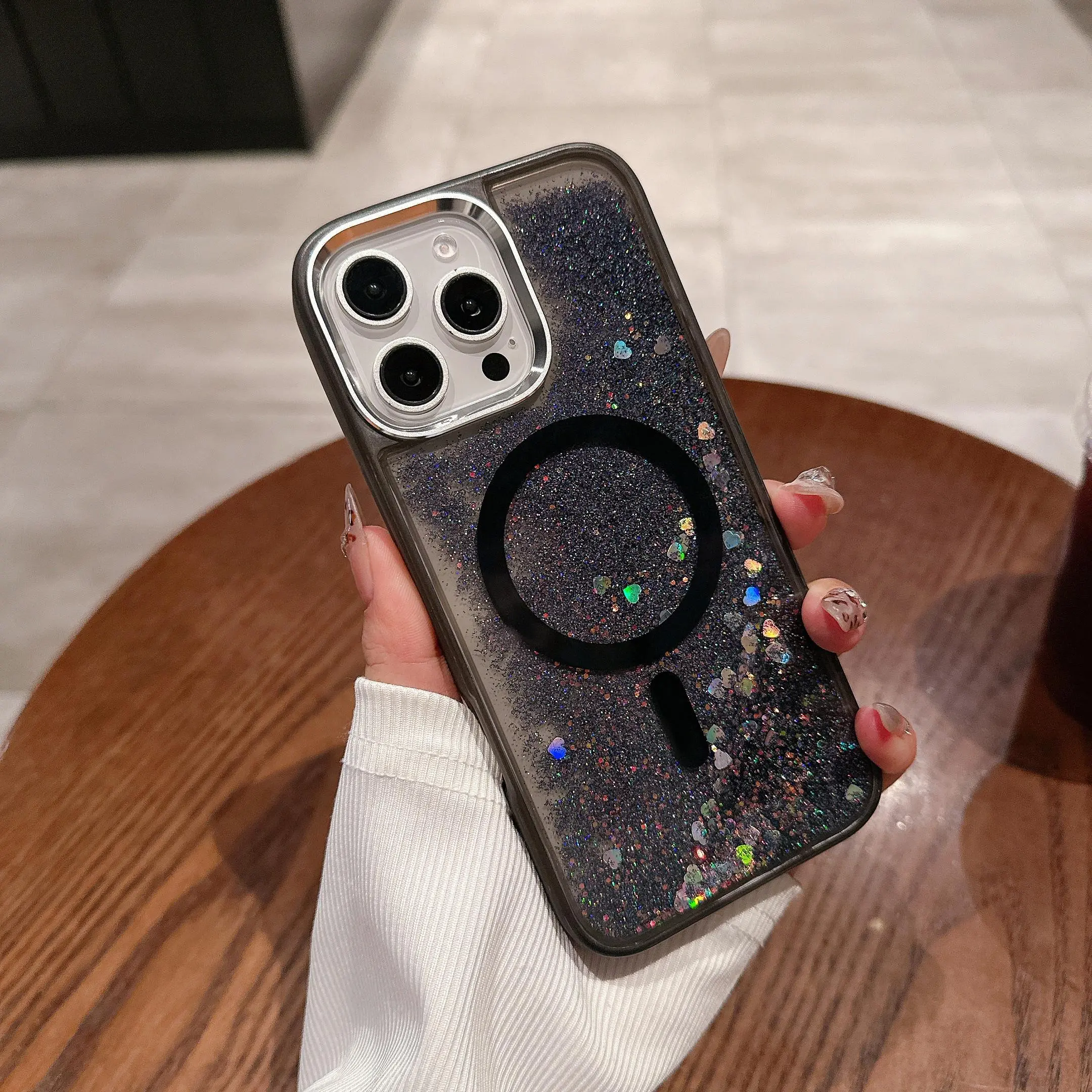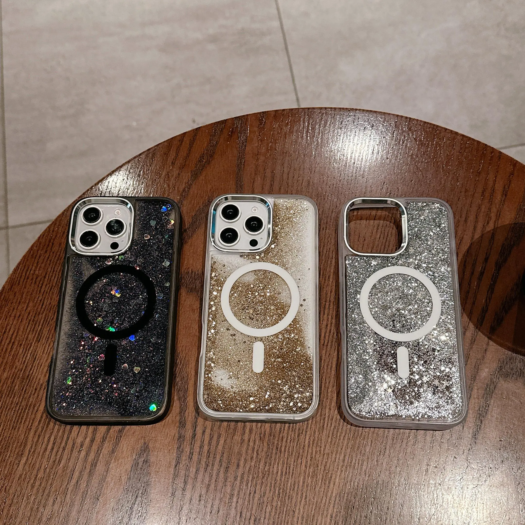 5. Glitter liquid glitter magnetic case – fits iPhones & Samsung models, black/gold/silver options, liquid dynamic design, wireless charging ready, sleek clear hard shell!