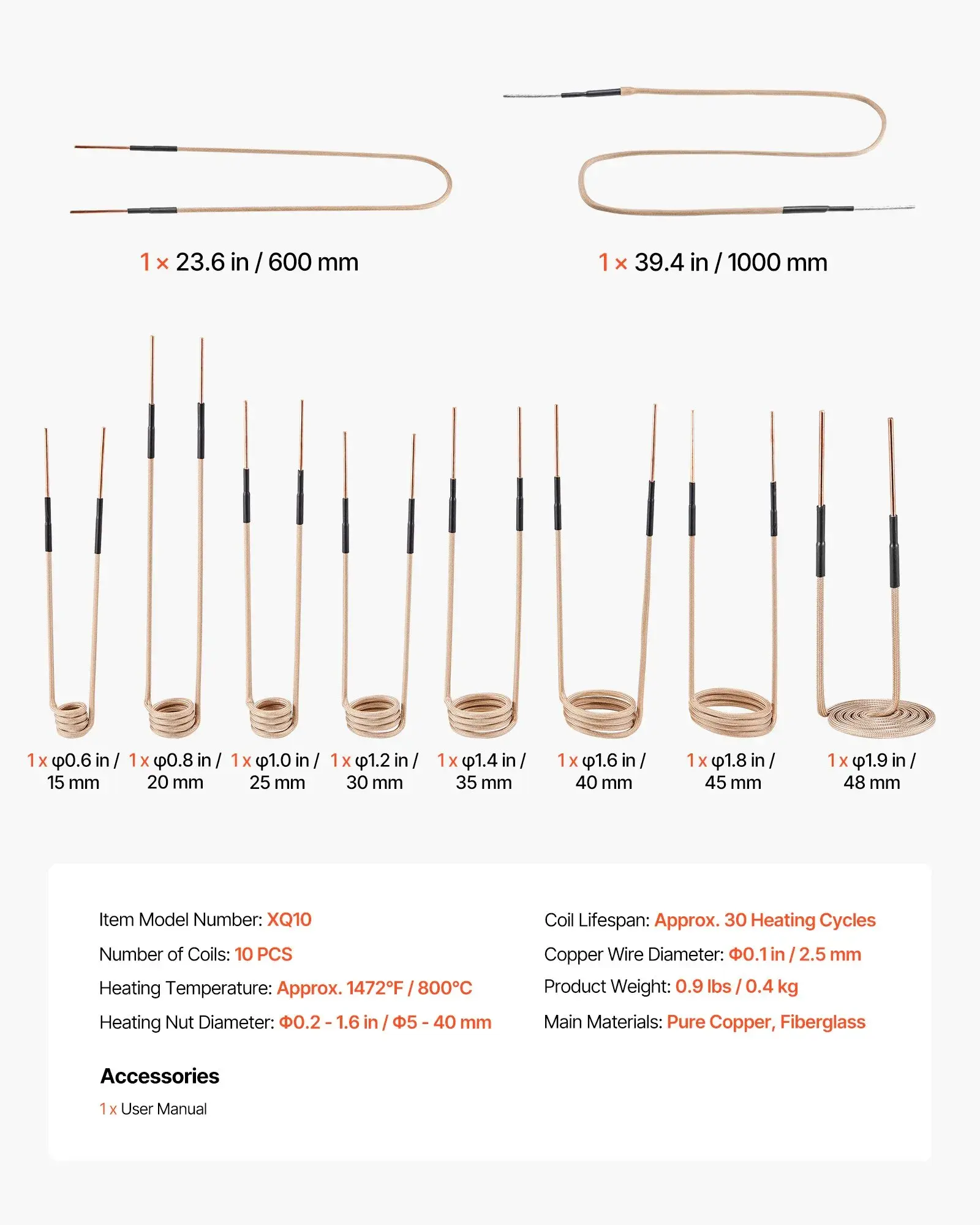 ·10-piece Coil Set: The heater coil kit includes 8 standard coils of different diameters, compatible with nuts ranging from 0.2-1.6 in / 5-40 mm, providing precise and efficient heating. The U-shaped and flexible coils are designed to handle irregular parts, long shafts, and curved workpieces. Suitable for a variety of vehicle and equipment maintenance