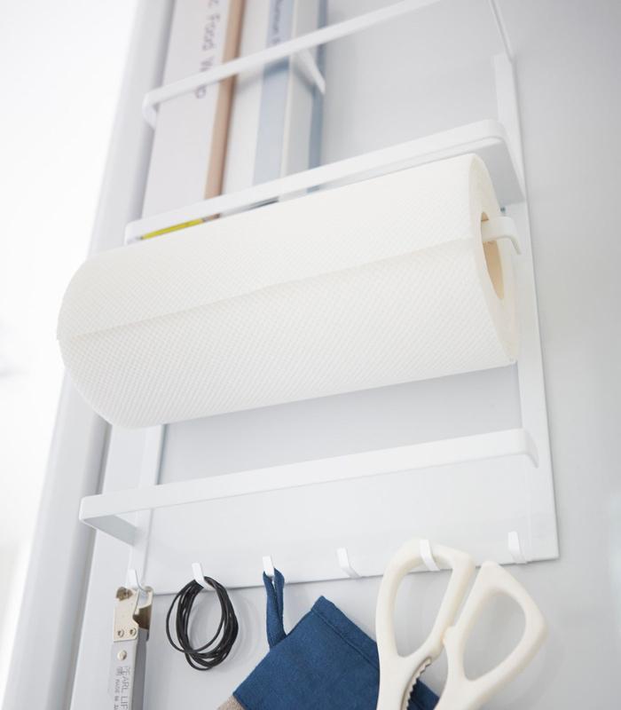 The rack to end countertop clutter. Put that fridge to *work*! A blank fridge is a missed opportunity! This simple, functional kitchen rack puts this under-utilized surface to good use by keeping frequently used items off of the counter, yet quickly accessible. Attach the strong magnet to your fridge in seconds and start piling on everything from paper towels to pot holders and hanging utensils. Your most-used items, within hand’s reach—now that’s convenient.