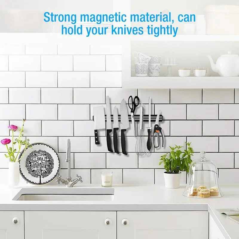 Introducing the practical tool carrier, designed specifically for the kitchen. This magnetic knife strip is crafted from durable stainless steel, ensuring it remains securely in place and won't rust or corrode over time.