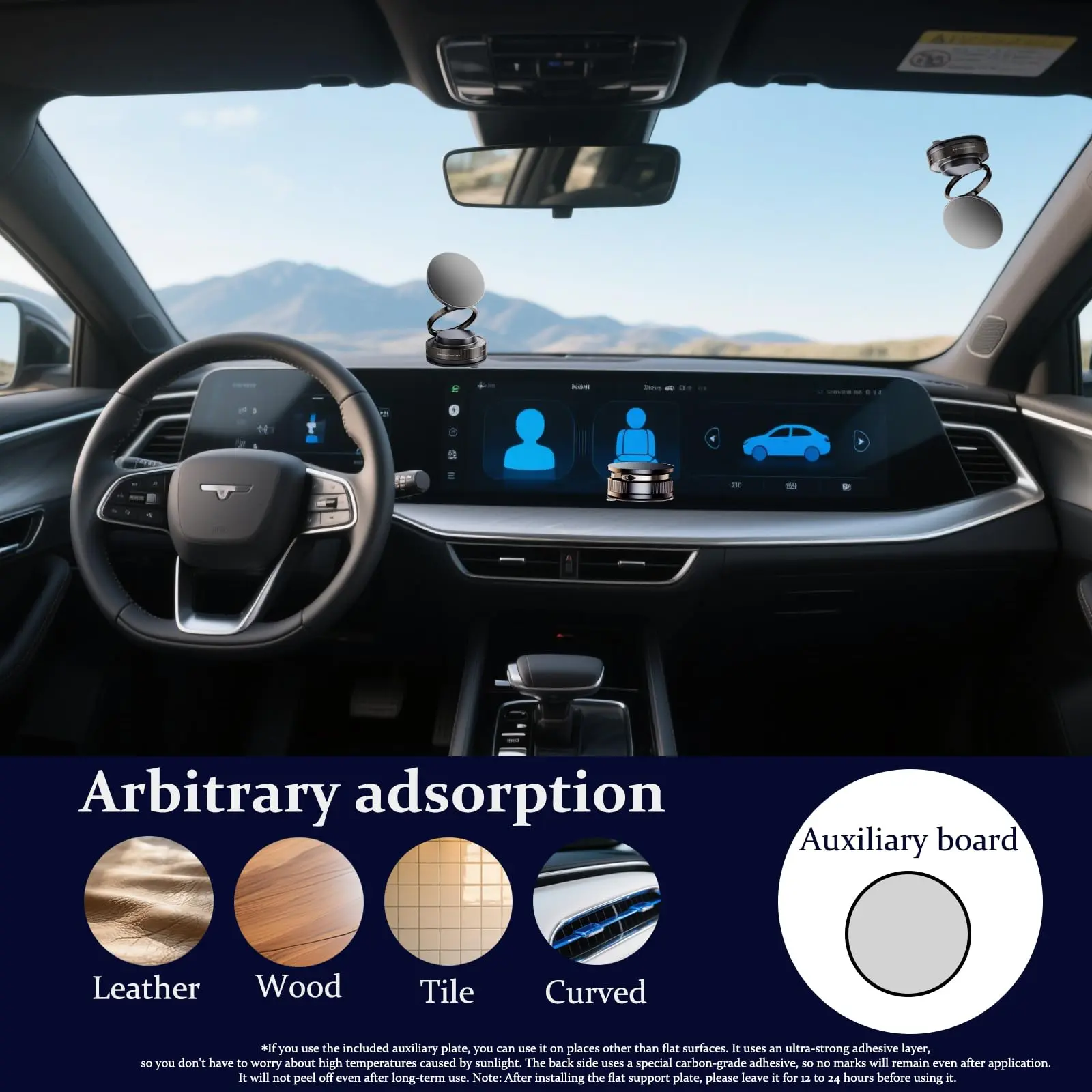 [Applicable Areas]This universal magnetic car mount securely attaches to any smooth surface, such as car windshields, glass tables, marble countertops, gym treadmills, or bathroom mirrors. It's perfect for driving, exercising, cooking, showering, and other everyday activities. Pro Tip: For uneven or textured surfaces, such as dashboards, use the included smooth plastic suction cup for enhanced adhesion.