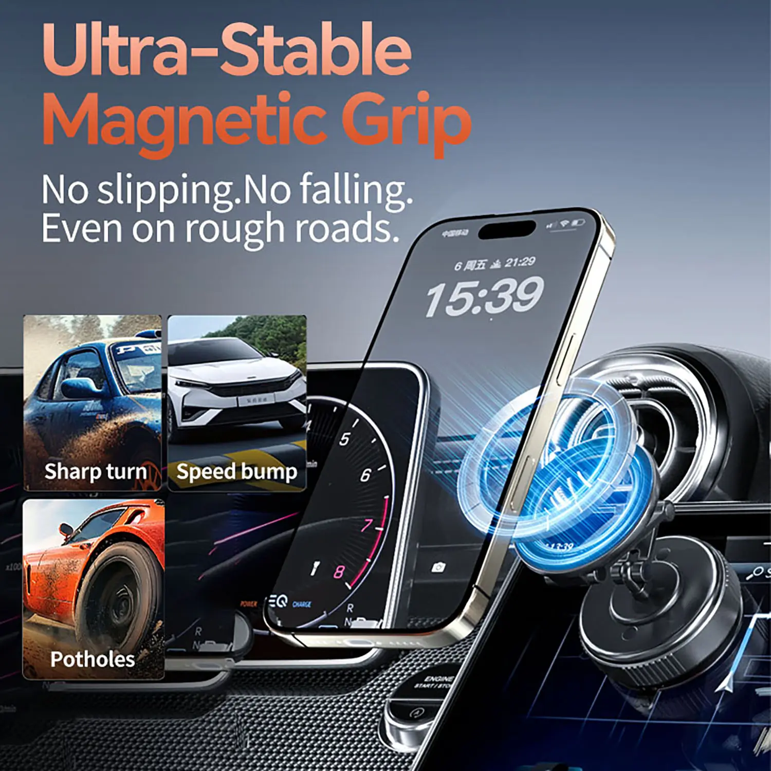 Designed with powerful N52 round magnets that generate up to 2400 gauss of force, this foldable magnetic phone holder has passed over 8000 vibration tests and simulated rough road conditions. Drive confidently—even on uneven roads, sharp turns, or during sudden braking—without worrying about dropping your phone.
