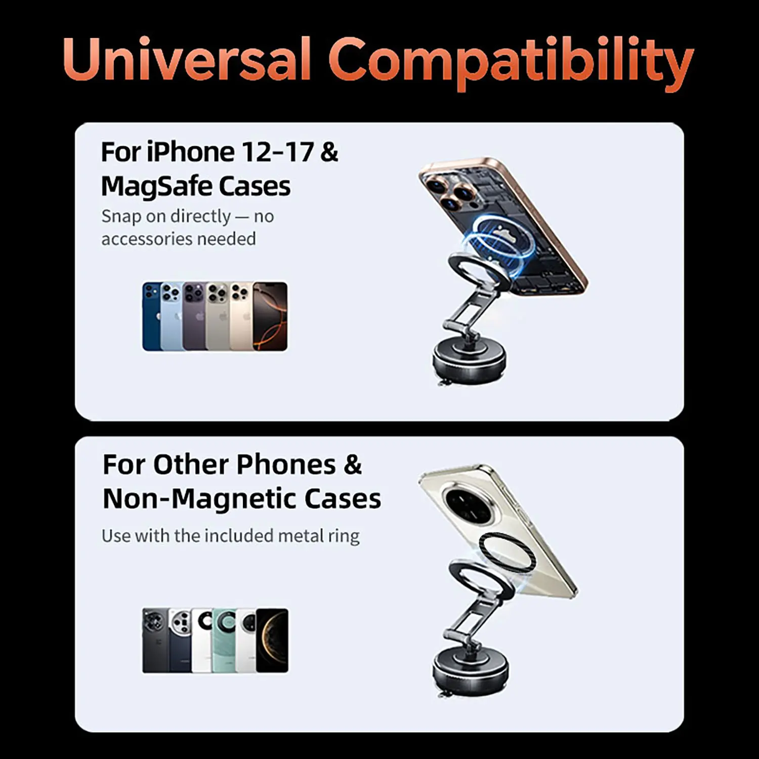Designed for iPhone 16/15/14/13/12 and all MagSafe devices. Additionally, it includes a magnetic ring to provide similar super secure attachment capabilities to phones without MagSafe (including Android). No one is left out!