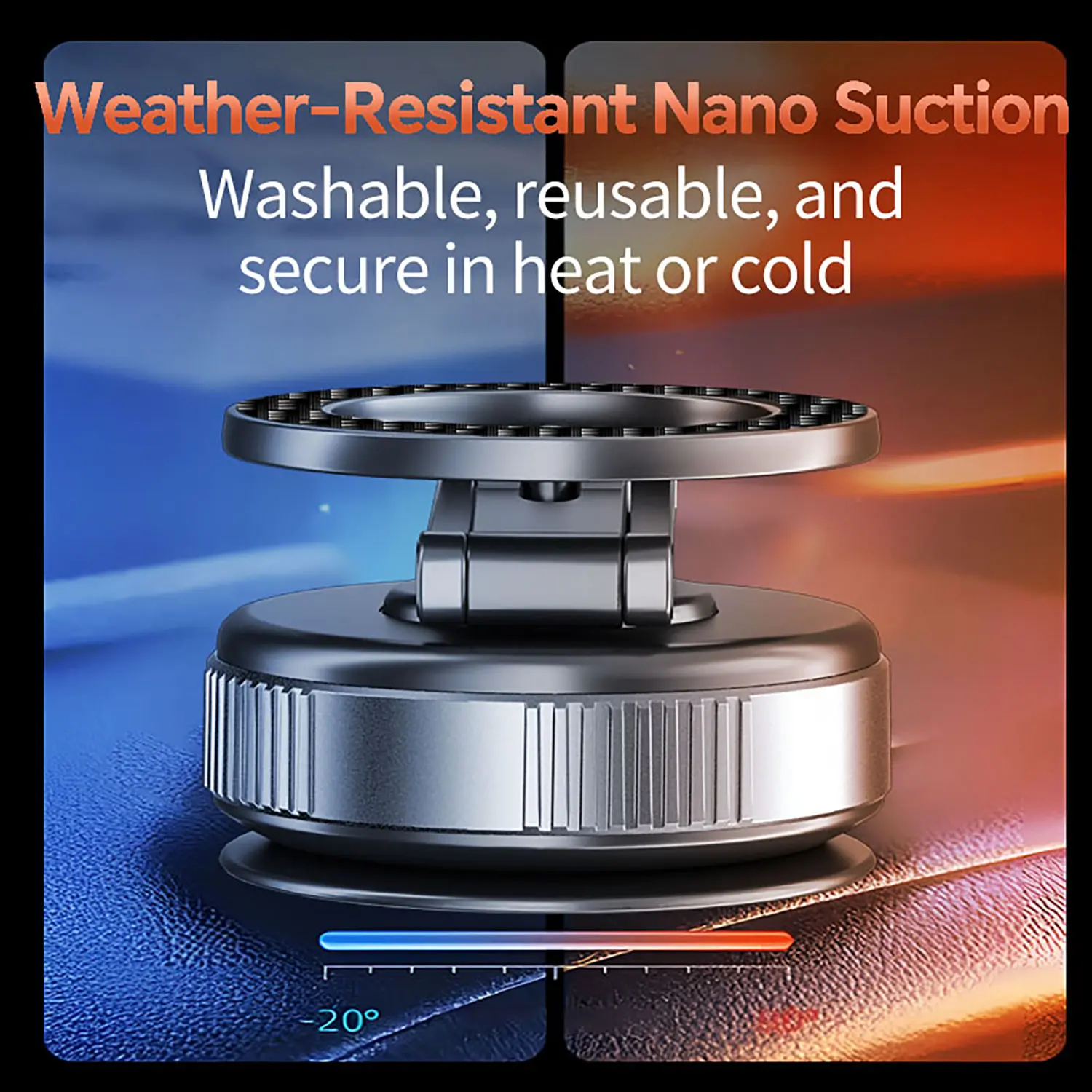 Upgraded with a rotating vacuum suction lock + Nano-Gel adhesive layer, our mount provides five times stronger grip compared to traditional mounts. It sticks firmly on all surfaces, withstands any impact or sharp turns, and can handle extreme temperatures ranging from -40°F to 300°F.