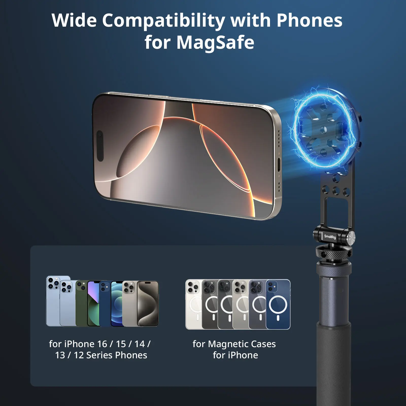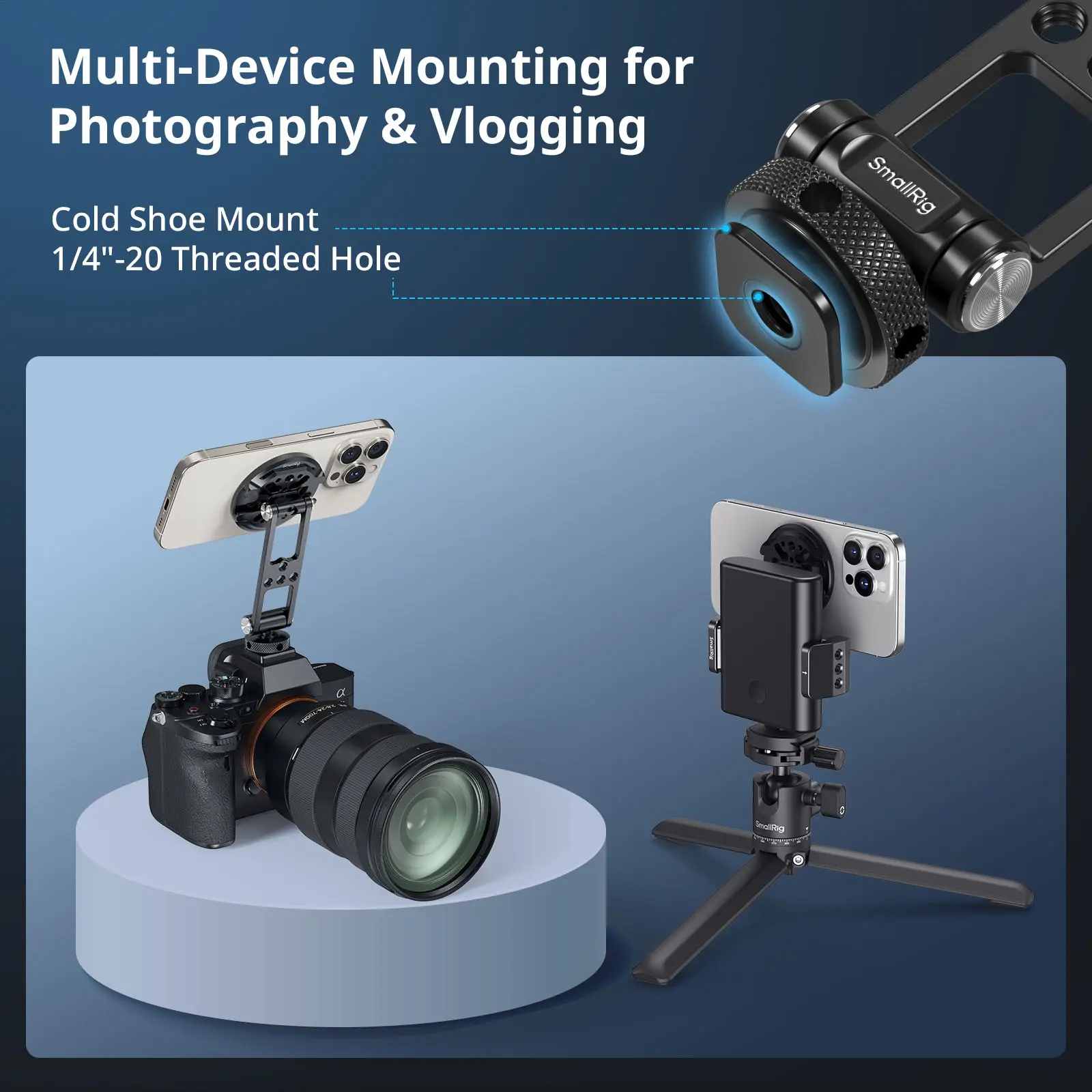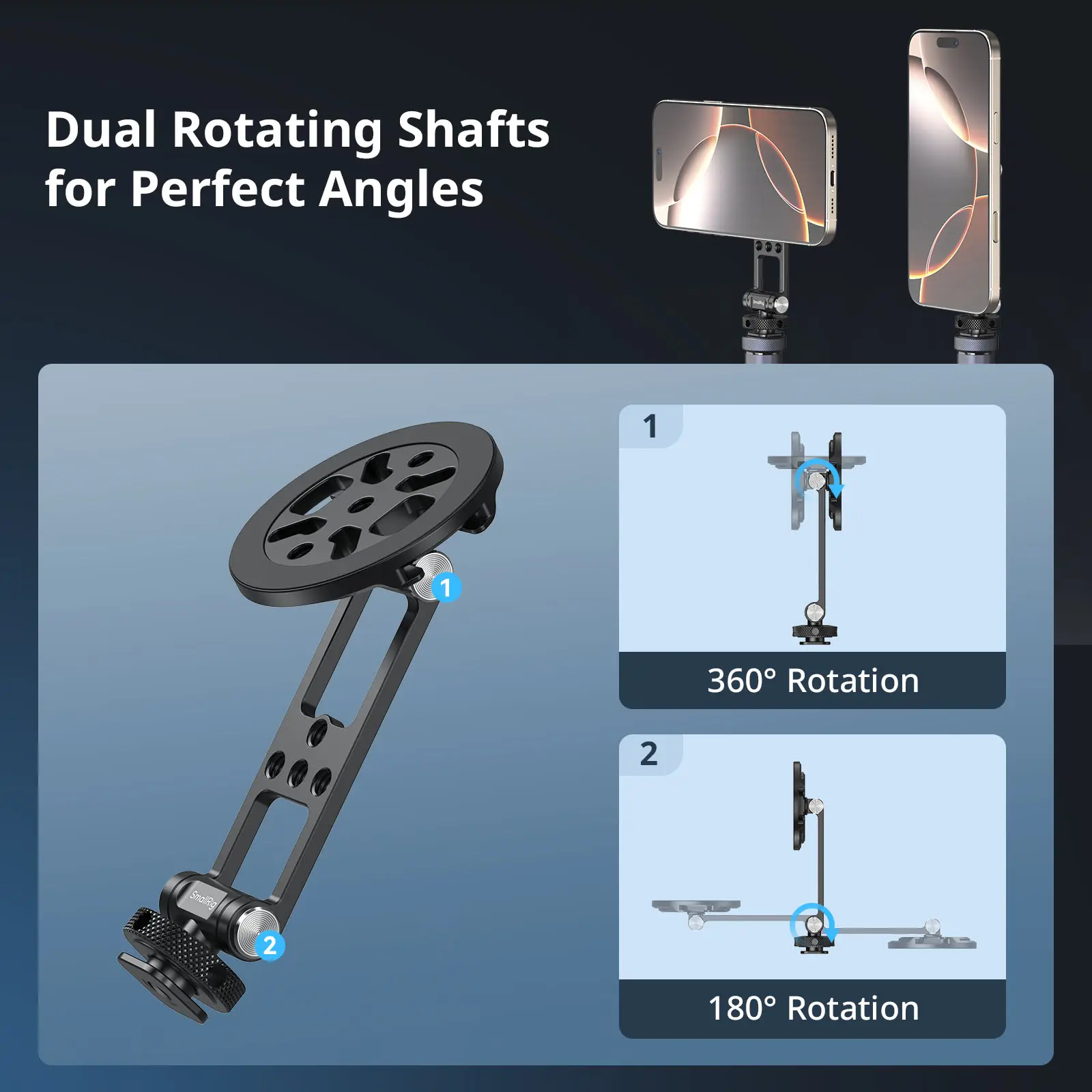 SmallRig Support with Cold Shoe Mount(for Phones)5156 is designed for indoor live streaming, outdoor selfies, camera monitoring, mobile photography, and teleprompter setups. Compatible with MagSafe-enabled iPhones, it allows for effortless attachment and quick switching between portrait and landscape modes. The mount support features two rotating shafts for flexible angle adjustments and multiple standard threaded holes in the middle for attaching power bank holders (ID 2336).