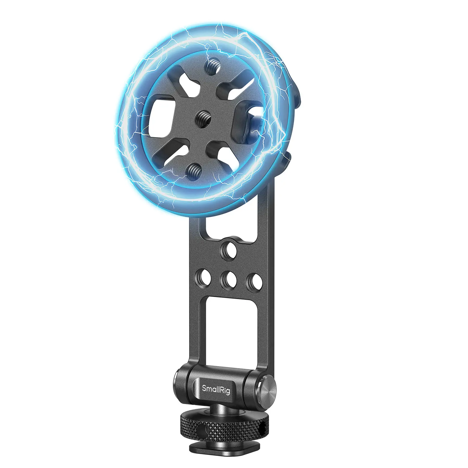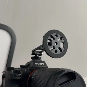 The bottom features one 1/4"-20 threaded hole and a cold shoe mount for the mounting on selfie sticks, tripods, cages, and stabilizers. Its modular design allows the top round plate to be detached and used as a multi-functional mounting plate for accessories like microphones and ball-head selfie sticks.