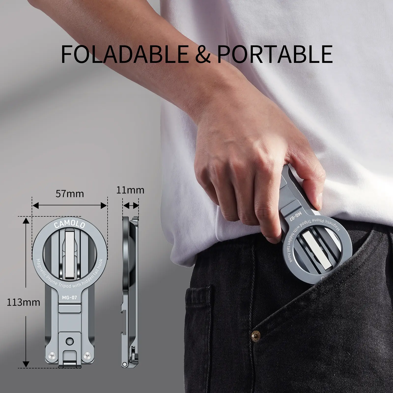 CAMOLO Magnetic Pocket Phone Tripod Foldable with Hook, MG-05G Phone Holder Compatiable with Magsafe for iPhone 16 15 14 13 12 Pro Max Plus Series, 1/4" Screw Tripod Mount, Lightweight Phone Stand Travel
