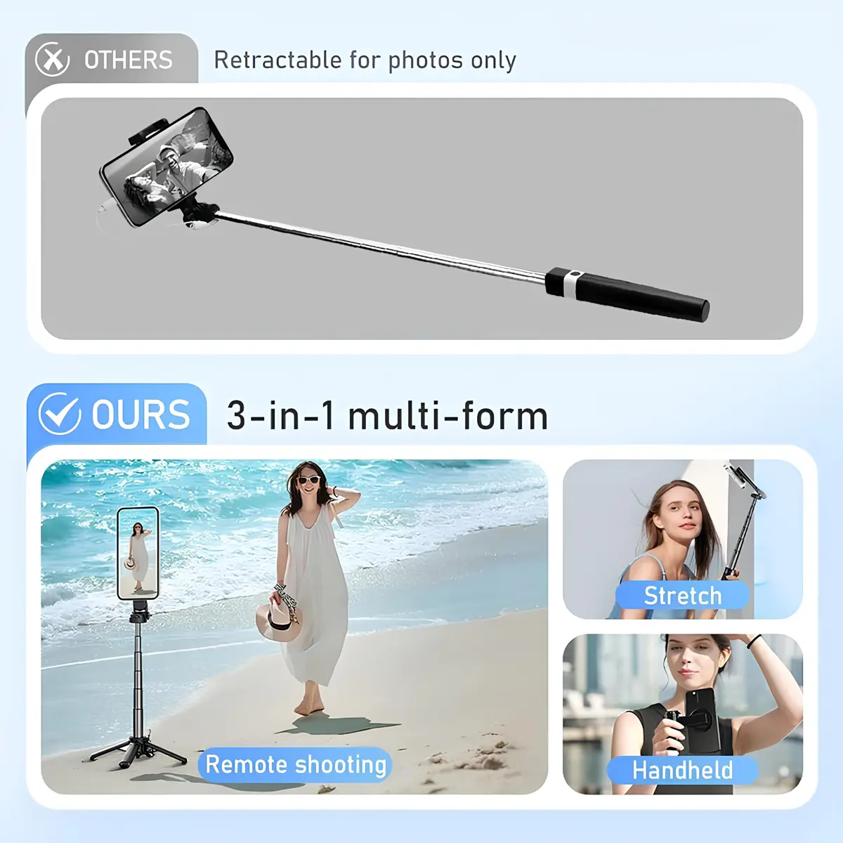 Telescopic Aluminum Pole & Stable Tripod Base : Featuring A Durable 16-Inch Aluminum Extension Pole And A Retractable Four-Leg Tripod, This Selfie Stick Tripod Offers Both Reach And Stability. Whether You'Re Snapping Full-Body Shots Or Filming Steady Video, Enjoy The Freedom To Shoot With Confidence Using This All-In-One Compact Selfie Stick