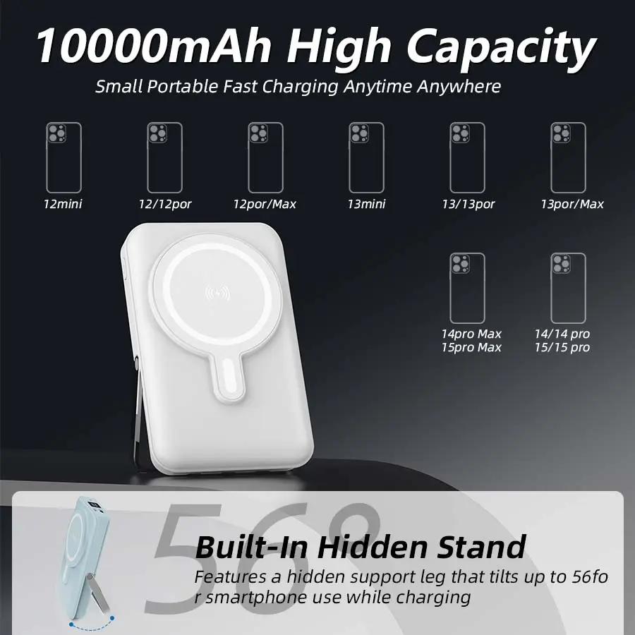 The Magnetic Power Bank features a sleek foldable design, making it incredibly portable. Its compact size ensures effortless carrying. Ideal for charging on the move, it's compatible with Mag-Safe Battery Pack 22.5W PD Fast Charging. Supports iPhone models from 16 down to Mini. Stay connected without compromising convenience.