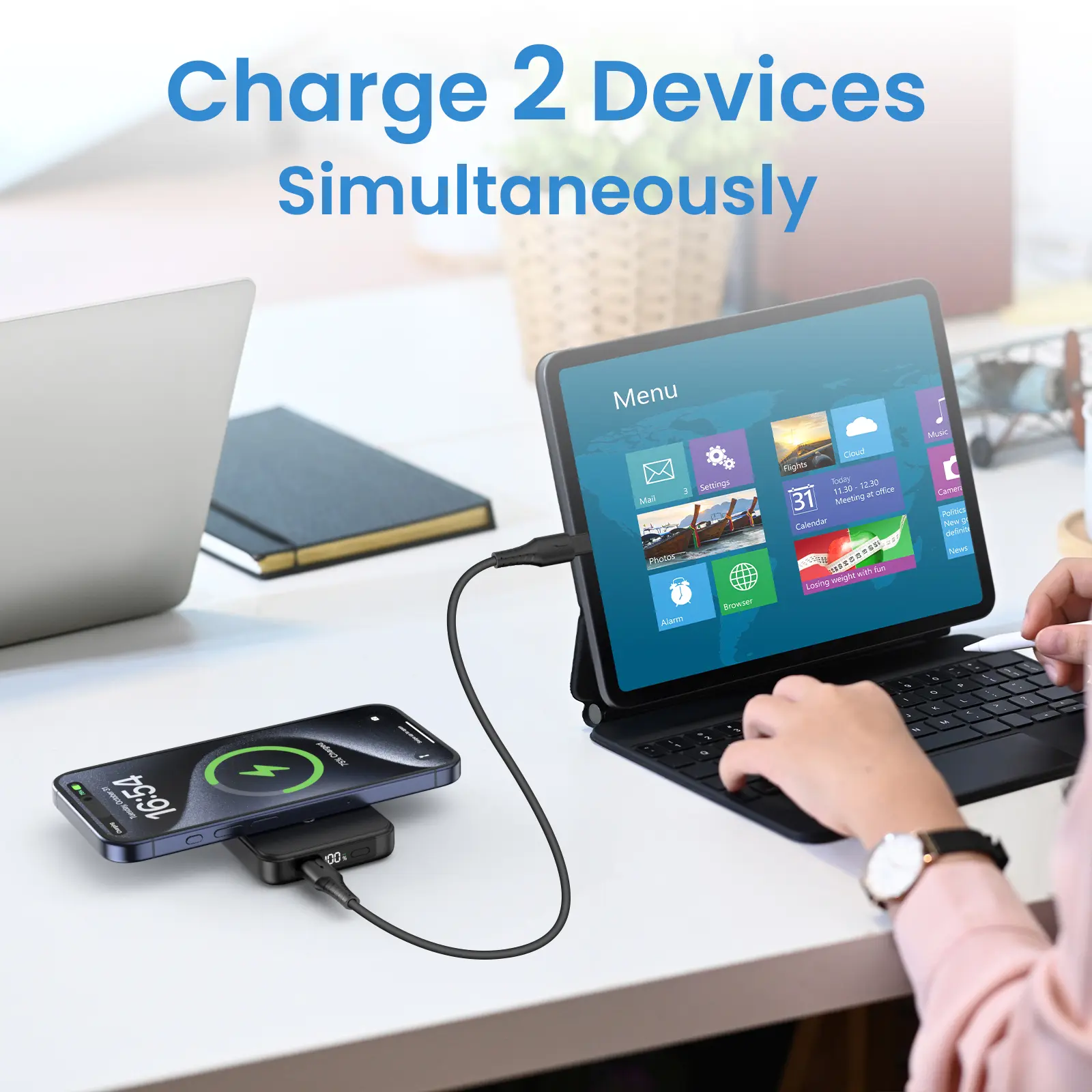2-in-1 Wireless Portable Charger: This wireless portable charger supports maximum 15W wireless fast charging and maximum 20W USB-C PD output, which can charge two devices at the same time and share the charging consumption.