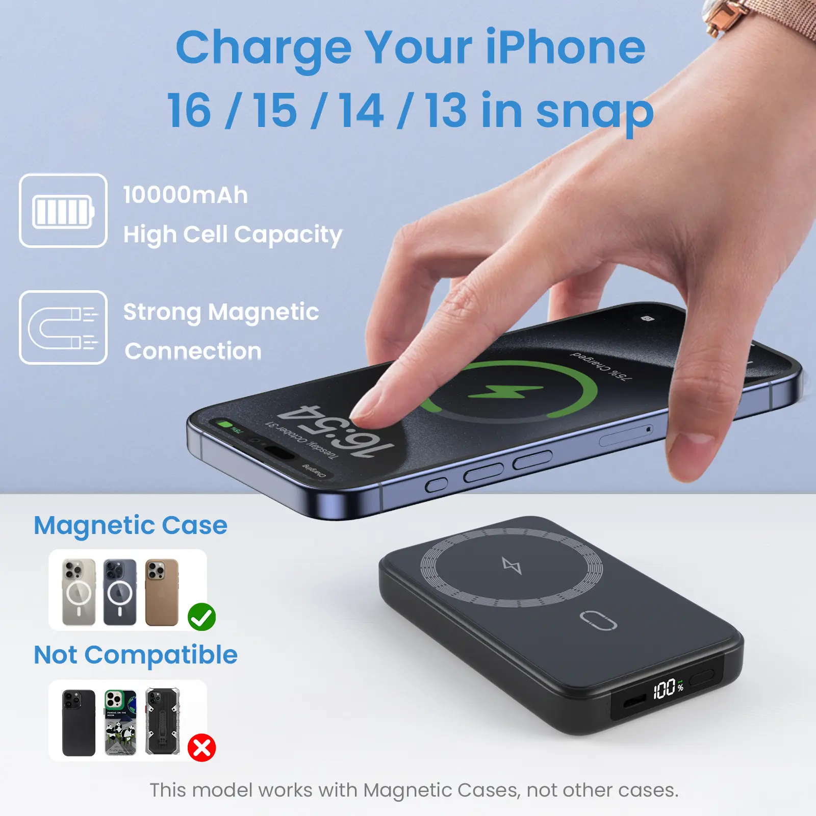 Strong Magnetic Wireless Charger: Mag-Safe battery pack can be firmly fixed on the back of iPhone 16/15/14/13/12 series to achieve up to 15W wireless magnetic fast charging. Note: The magnetic suction function only supports iPhone 16/15/14/13/12 series, we recommend using Mag-Safe phone case or charging without phone case to get enough suction.